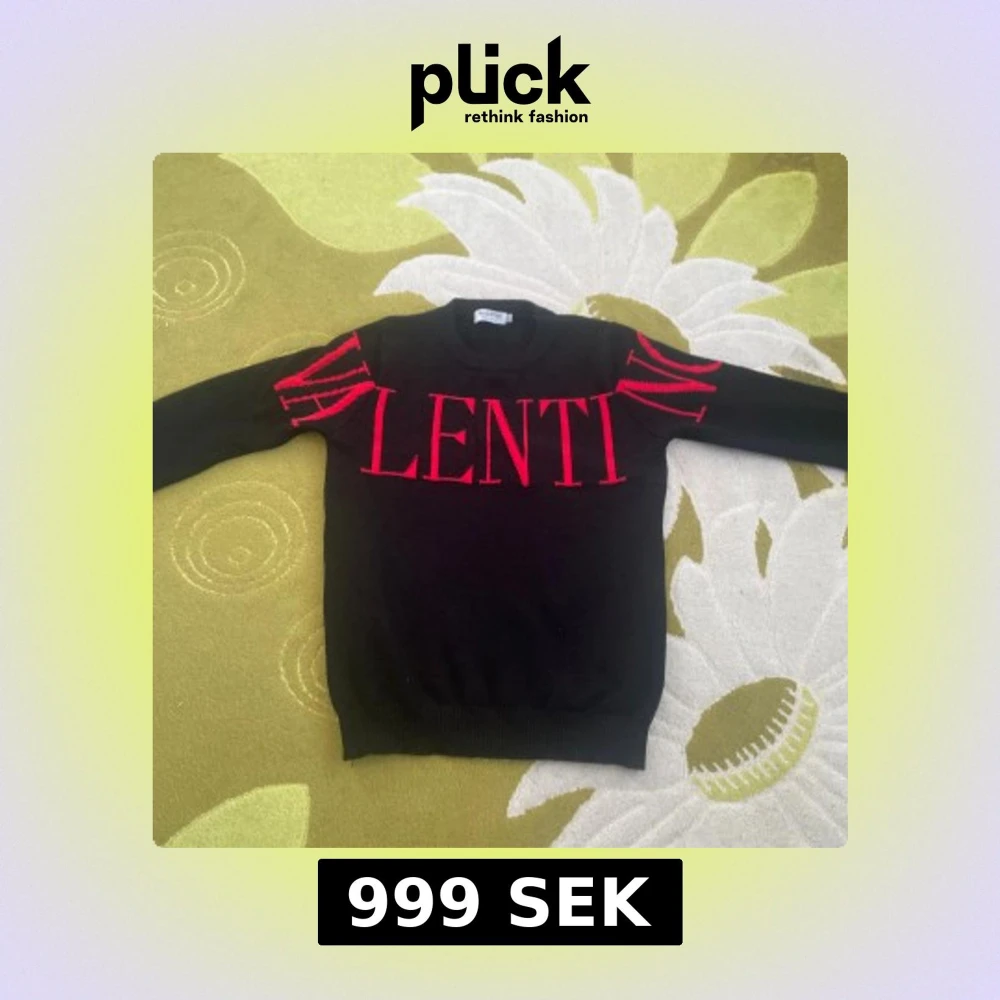 Säljer en svart tröja från Valentino med stor röd logotyp som sträcker sig över bröstet och ut på ärmarna. Tröjan har rund halsringning och är långärmad. Materialet är mjukt och stickat, perfekt för dig som gillar statement-plagg.