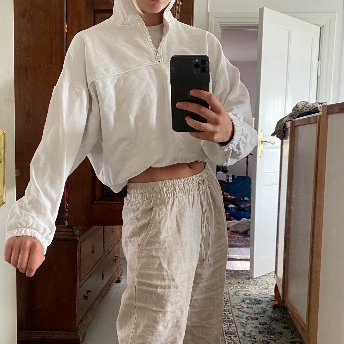 Vit croppad sweater med resår i muddarna och en dragkedja i kragen.