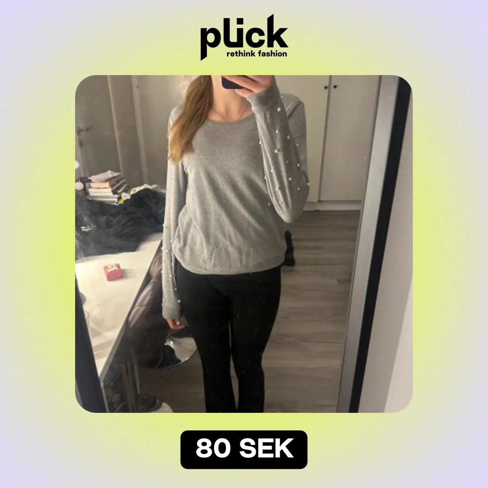 En vanlig grå sweatshirt som har vita pärlor nedtill ärmarna