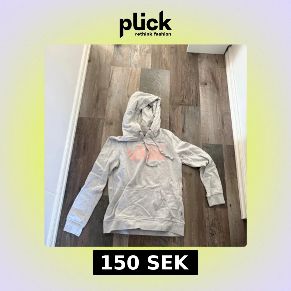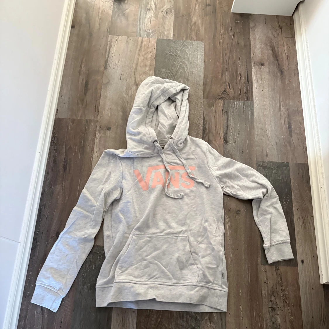 Säljer en ljusgrå hoodie från Vans med rosa logga framtill. Tröjan har huva med snörning och en stor magficka. Perfekt för dig som gillar en avslappnad och cool stil.