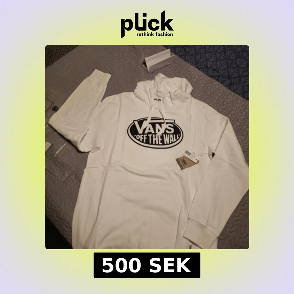 Säljer en snygg vit hoodie från Vans med det klassiska 'Off The Wall' trycket i svart på bröstet. Hoodien har en justerbar huva med snören och en stor magficka framtill. Perfekt för en avslappnad stil!