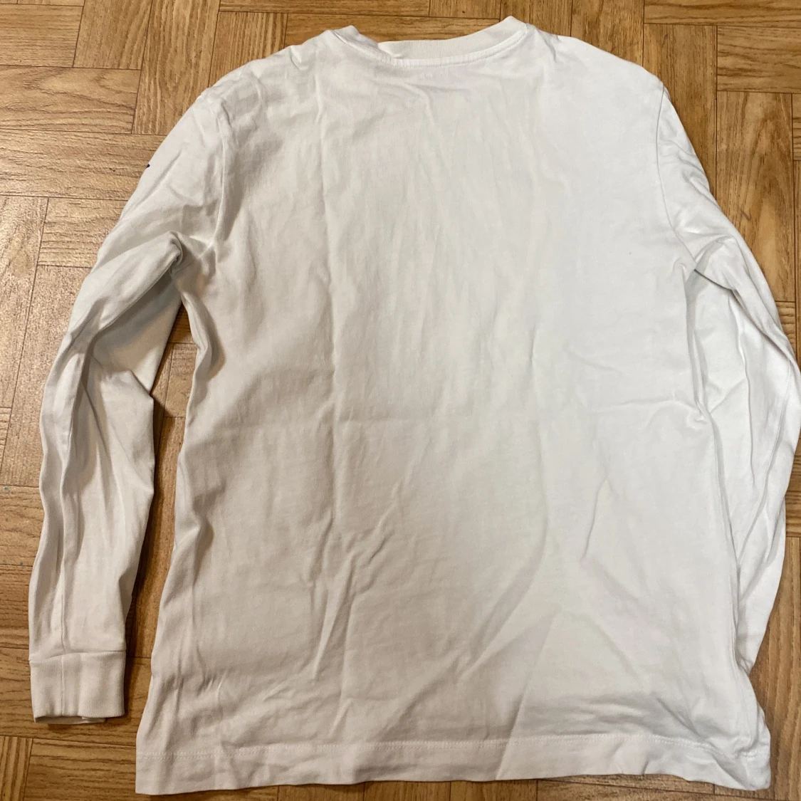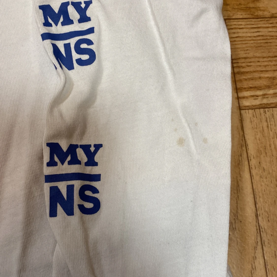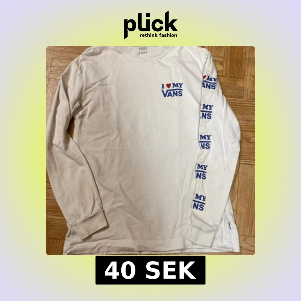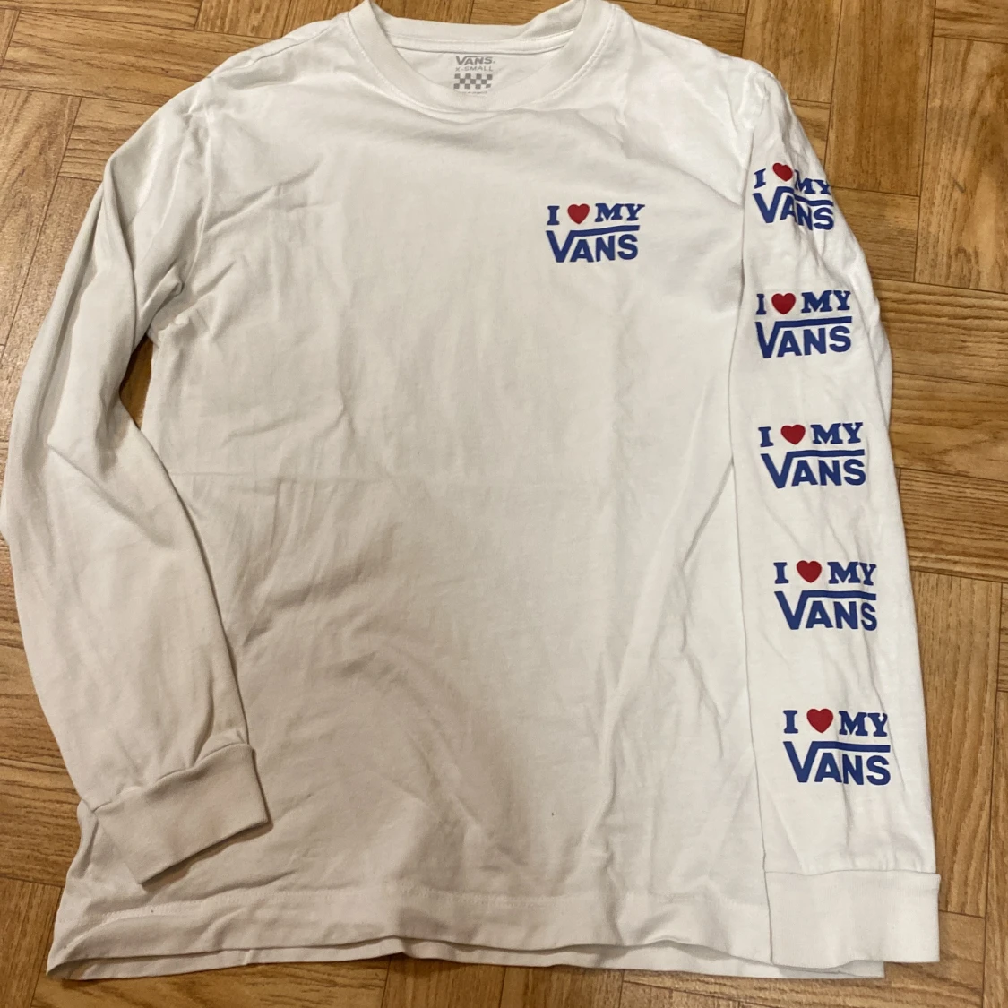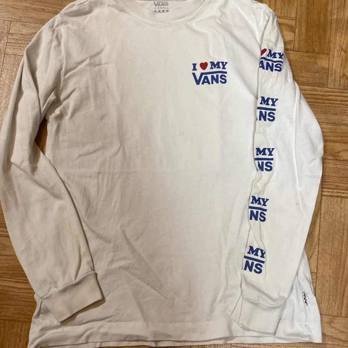 Säljer en vit långärmad tröja från Vans med trycket 'I ❤️ MY VANS' i blått och rött på bröstet och längs ärmen. Perfekt för dig som älskar streetwear och vill ha en bekväm och stilren look. Passar bra till jeans eller shorts för en avslappnad stil. Tyvärr är det en fläck på ärmen - se bild , vet ej om den går bort i tvätten men tror det