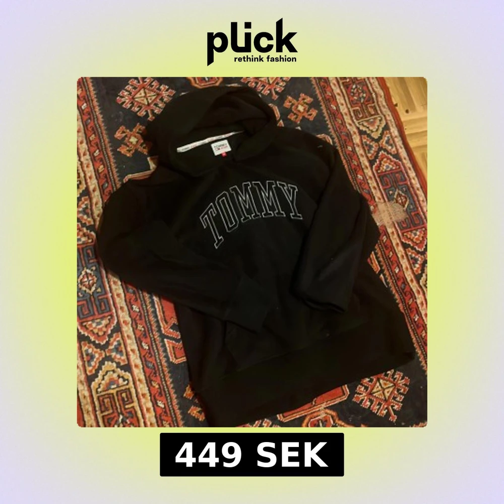 Säljer en svart hoodie från Tommy Jeans med stor text på framsidan. Den har en klassisk design med huva och långa ärmar. Tröjan är vädlift mjuk med bra material som gör den skön att ha på sig. Storlek M