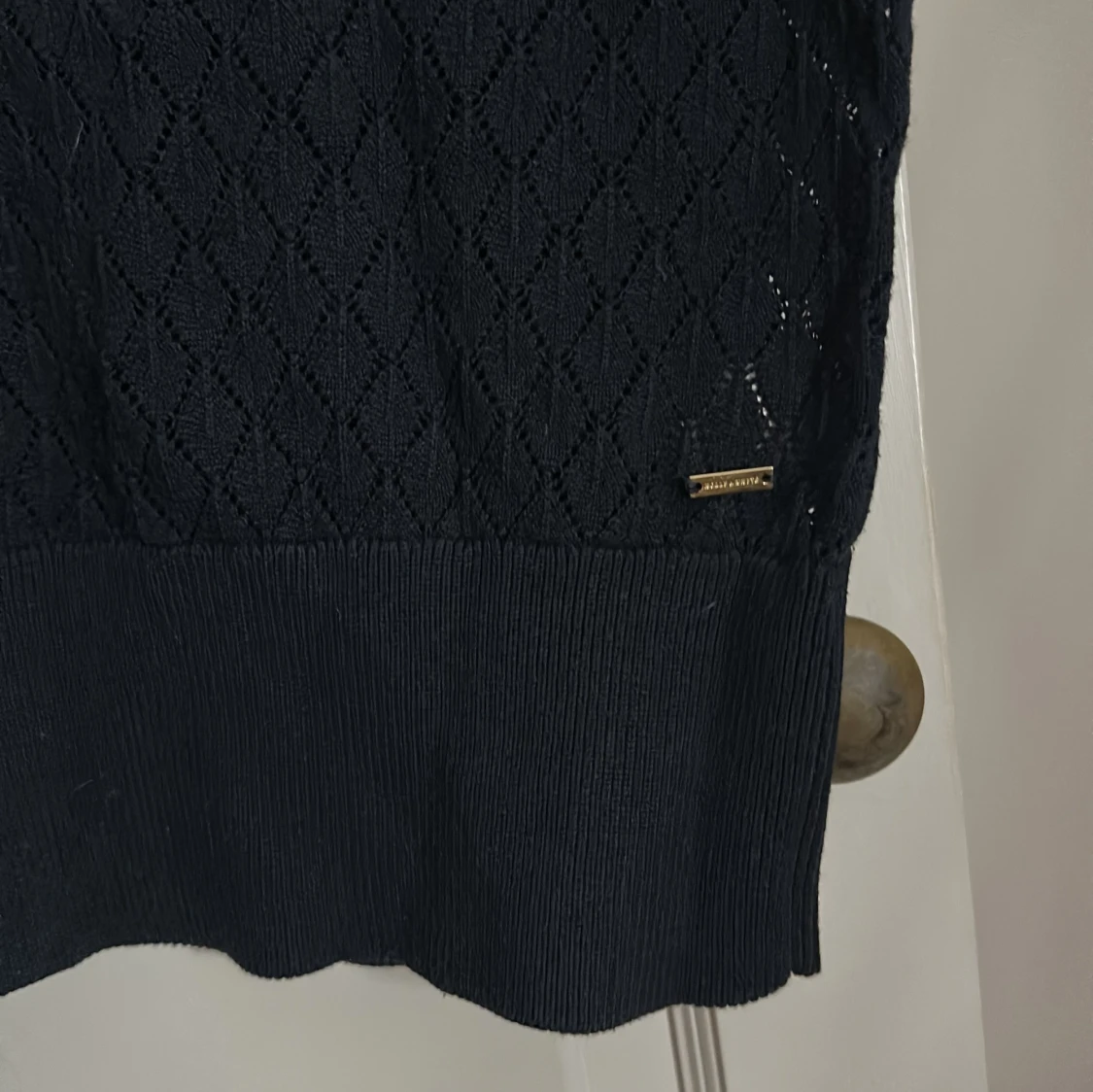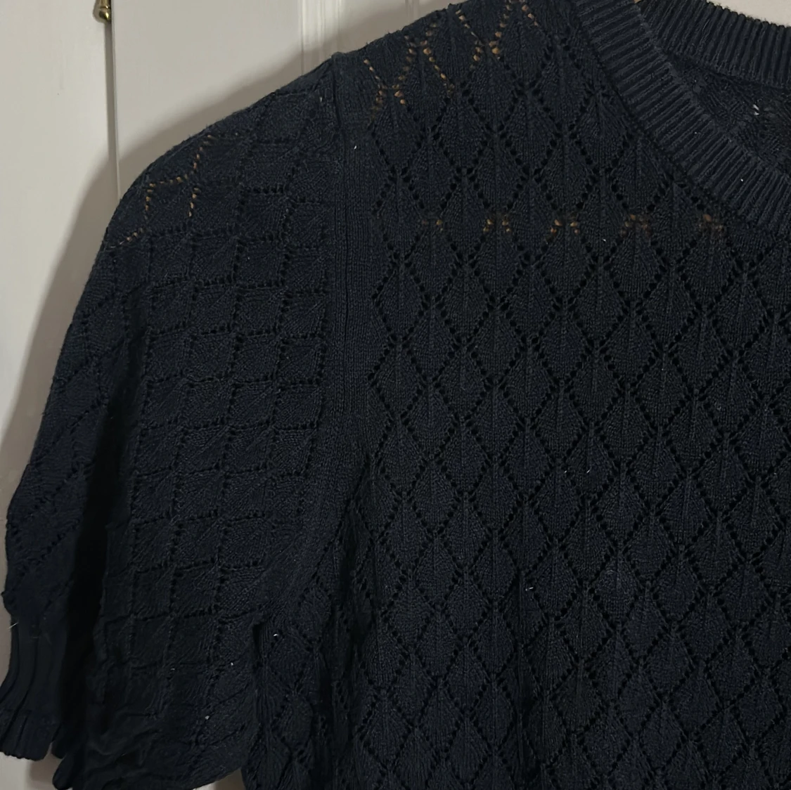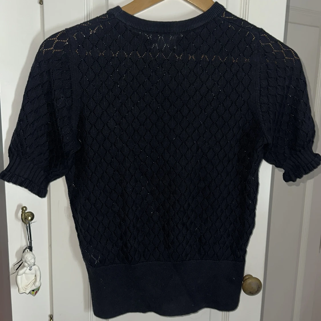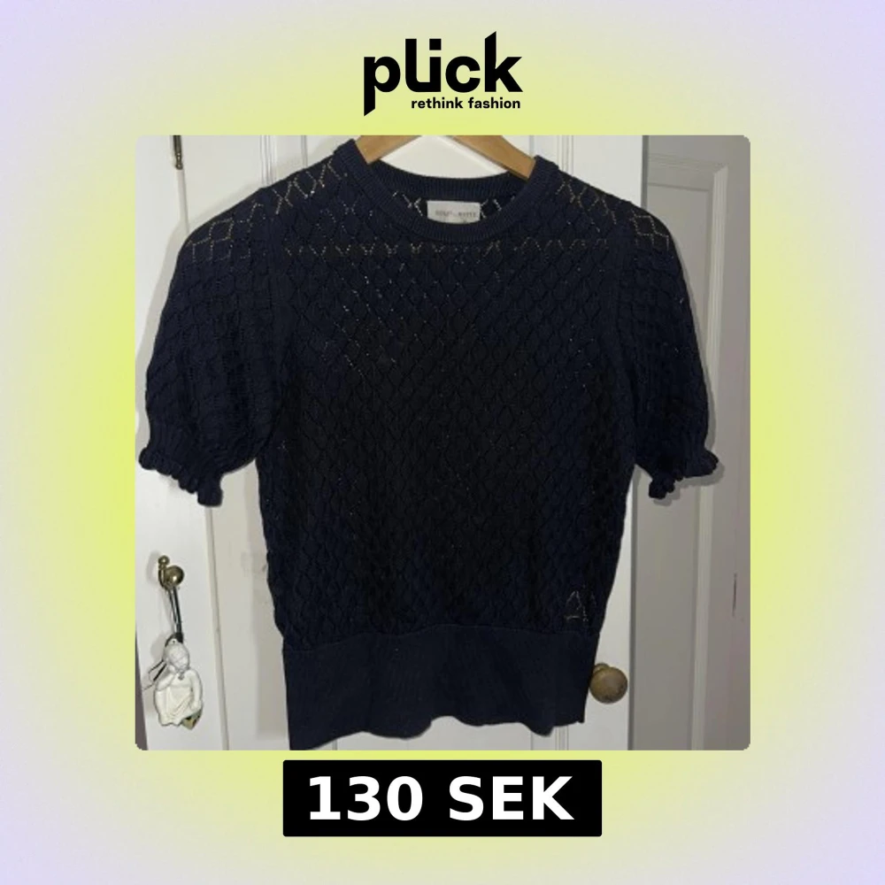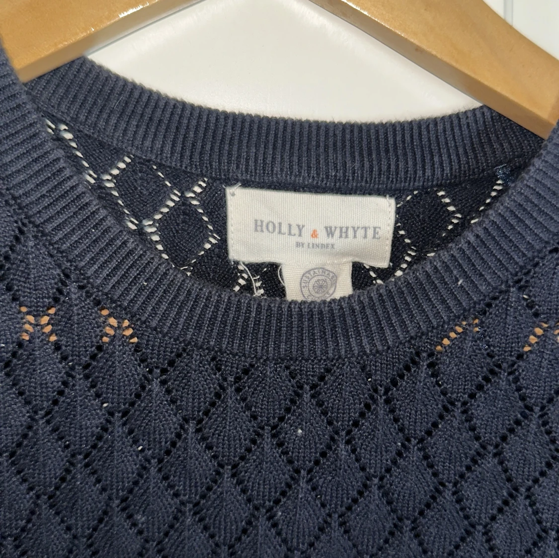 Supersöt mörkblå stickad topp från Holly & Whyte med korta puffärmar och ribbade kanter. Snyggt hålmönster över hela tröjan ger en luftig känsla. Perfekt till jeans eller kjol för en chill och trendig look. Den har legat i min garderob och aldrig använt den ‼️ Den ser jävligt mysig ut och kan nog bli en populär hitt bland dig som vill köpa den tröjan 🥰☺️