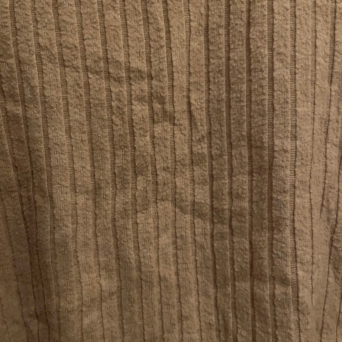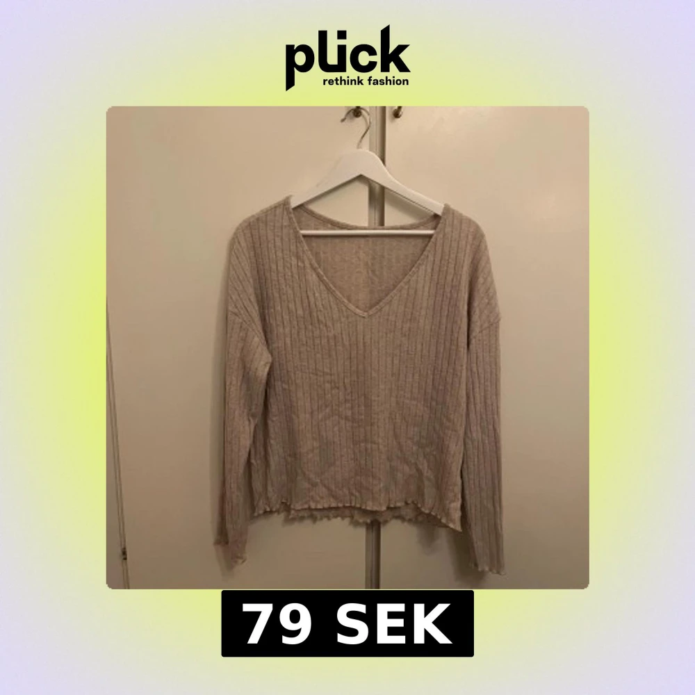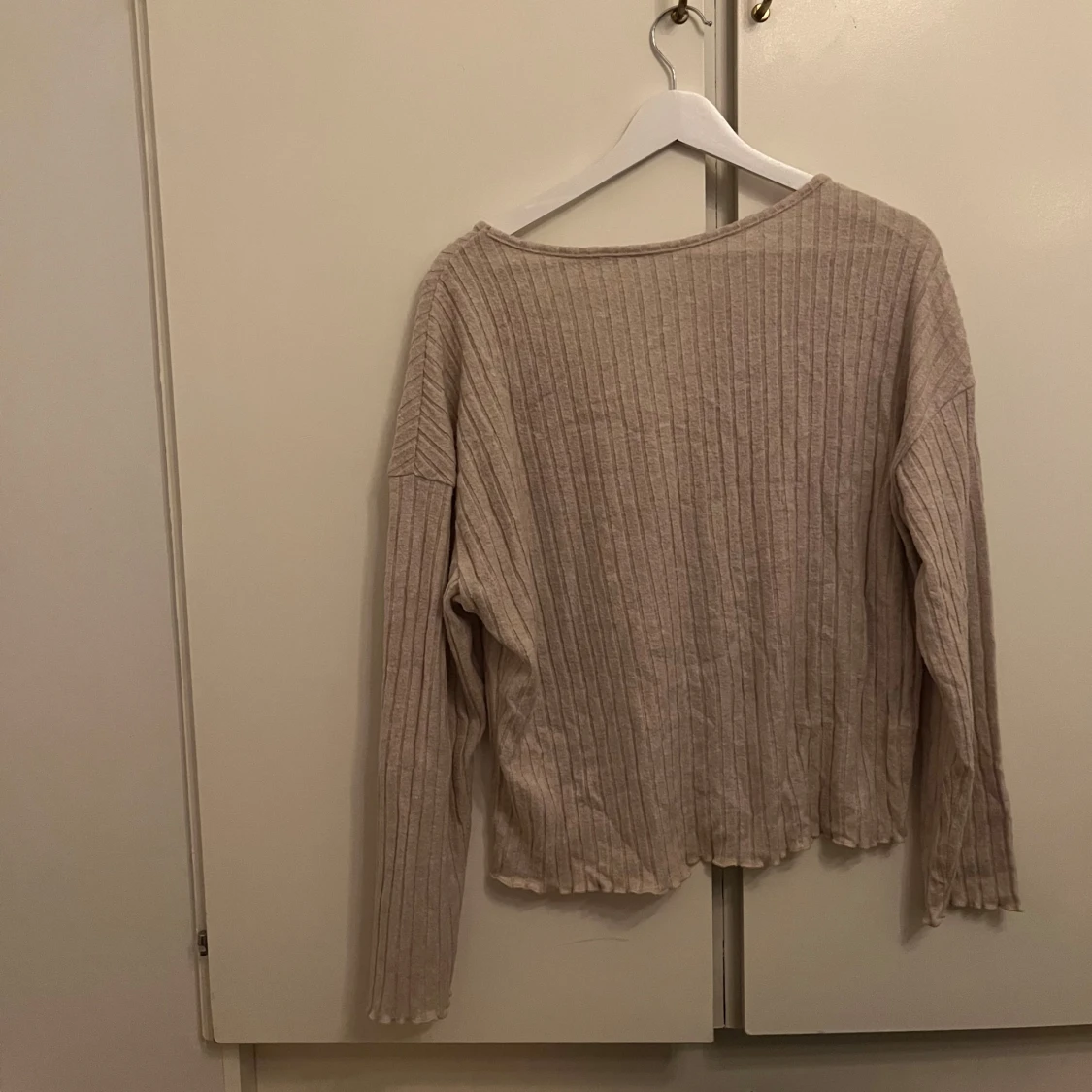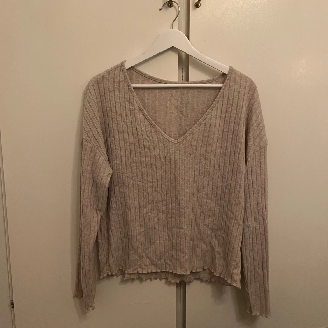 Säljer en beige ribbad tröja med v-ringning och långa ärmar. Perfekt för en avslappnad stil. Tröjan har en lös passform och är tillverkad i ett mjukt material.