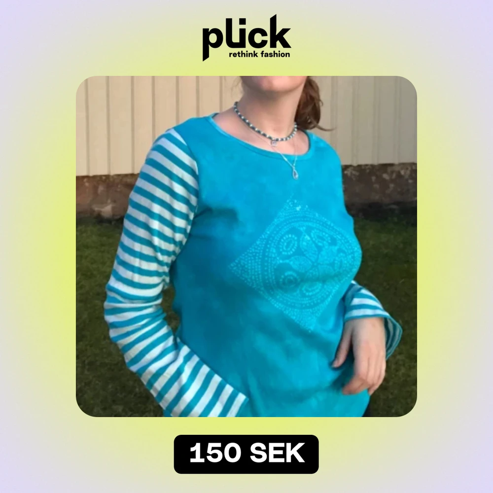 Säljer en cool turkos tröja med ett unikt mönster på framsidan. Den har randiga ärmar i turkos och vitt som ger en snygg kontrast. Perfekt för en avslappnad stil och passar bra till både jeans och kjol. Tröjan är i bra skick och redo för nya äventyr!