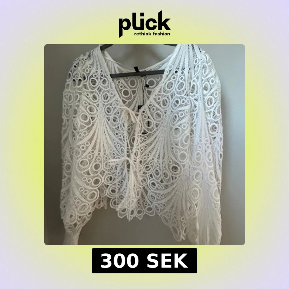 Säljer en elegant vit spetsblus från Vero Moda med v-ringning och knytning framtill. Blusen har ett unikt cirkulärt mönster och långa ärmar, perfekt för en stilfull look. Passar bra till både jeans och kjol. 🌟