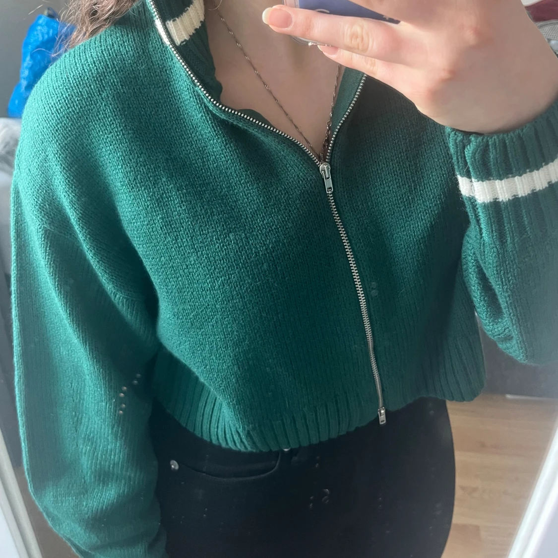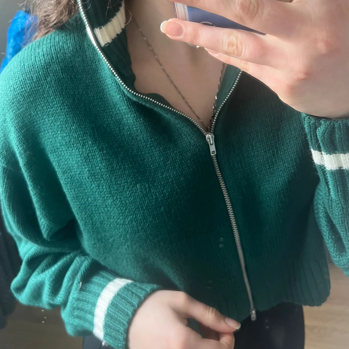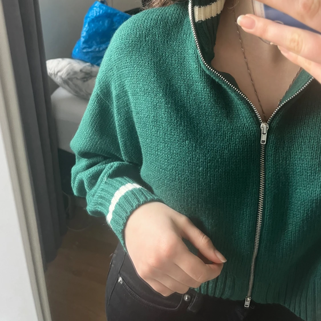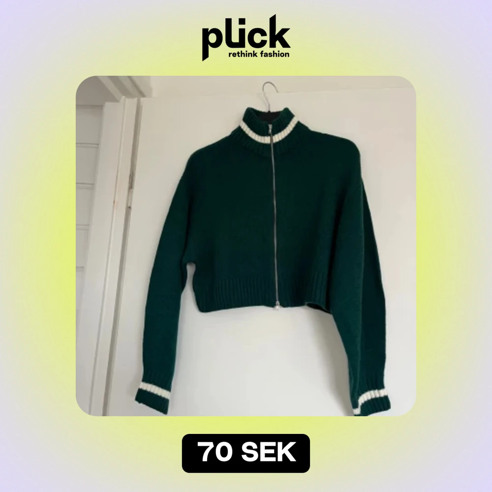 Säljer en fin tröja med dragkedja i mitten. Säljer den på grund av att den inte kommer till användning långre. I nästan helt nytt skick. Har använts 3-5 gånger. Jätte fin grön färg med detaljer av vita rader. Har en krage som gör dig varm.