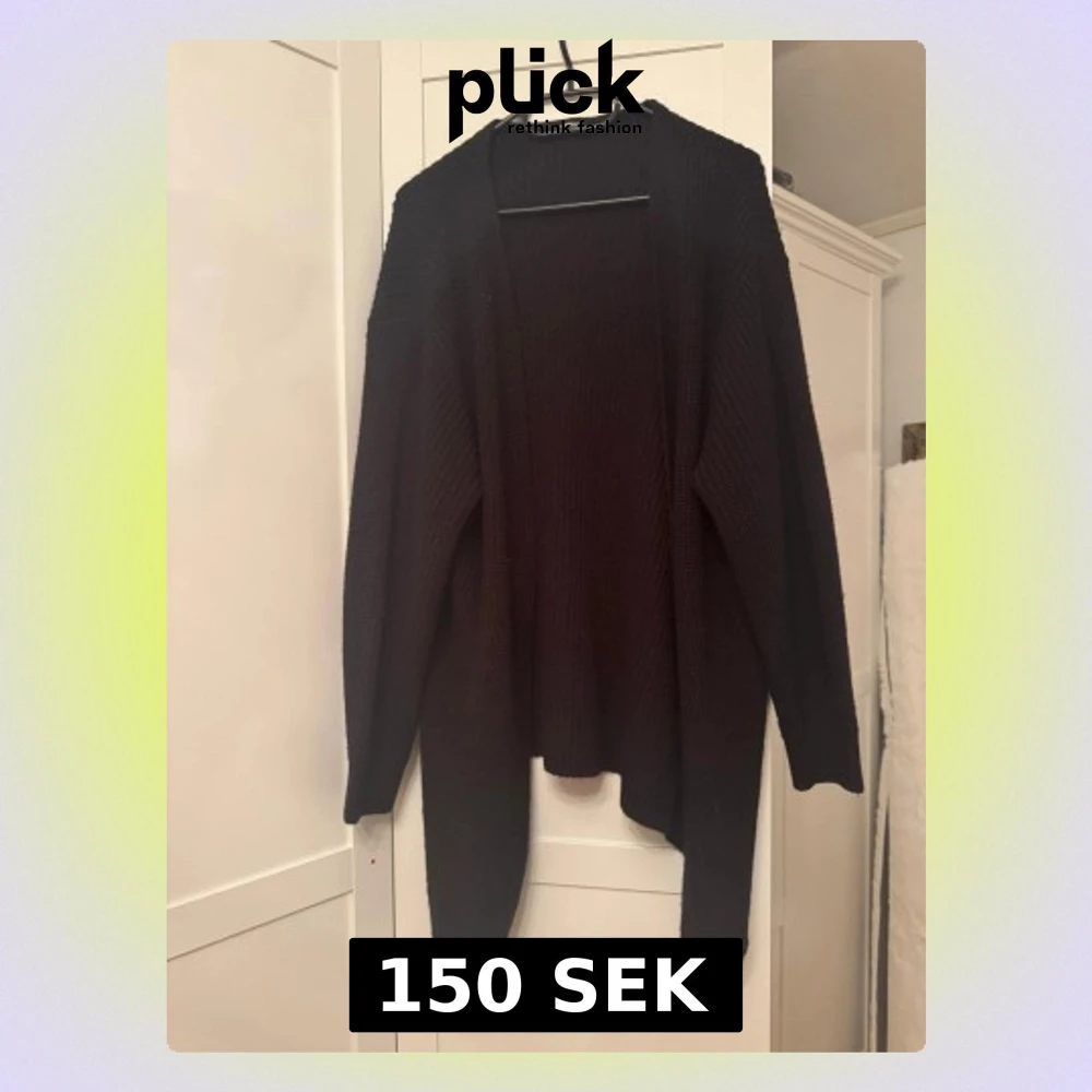 Svart kofta utan knappar. Lappen sitter inte kvar men koftan passar runt M skulle jag säga men den hade också kunnat vara onesize, men den sitter iallafall loose. Skriv ifall det finns några funderingar🤗💕
