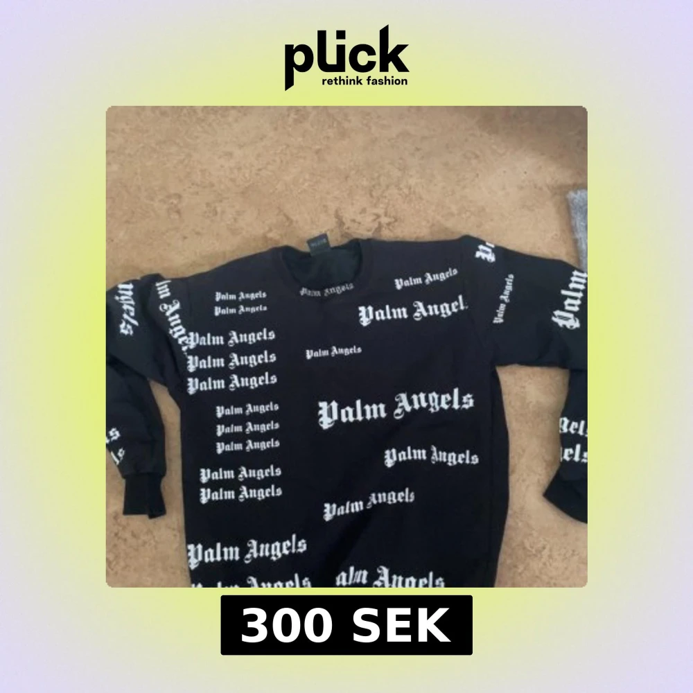 Svart sweatshirt från Palm Angels i storlek M med vit logotyp tryckt över hela tröjan. Långärmad modell med rund halsringning och ribbade muddar. Perfekt för dig som gillar streetwear och vill sticka ut med en bold look.