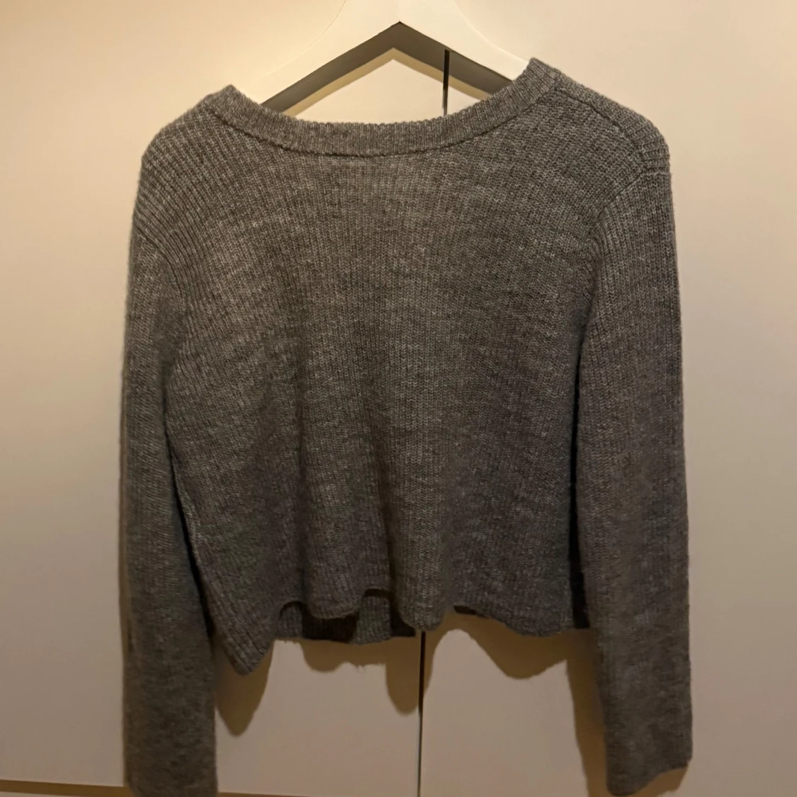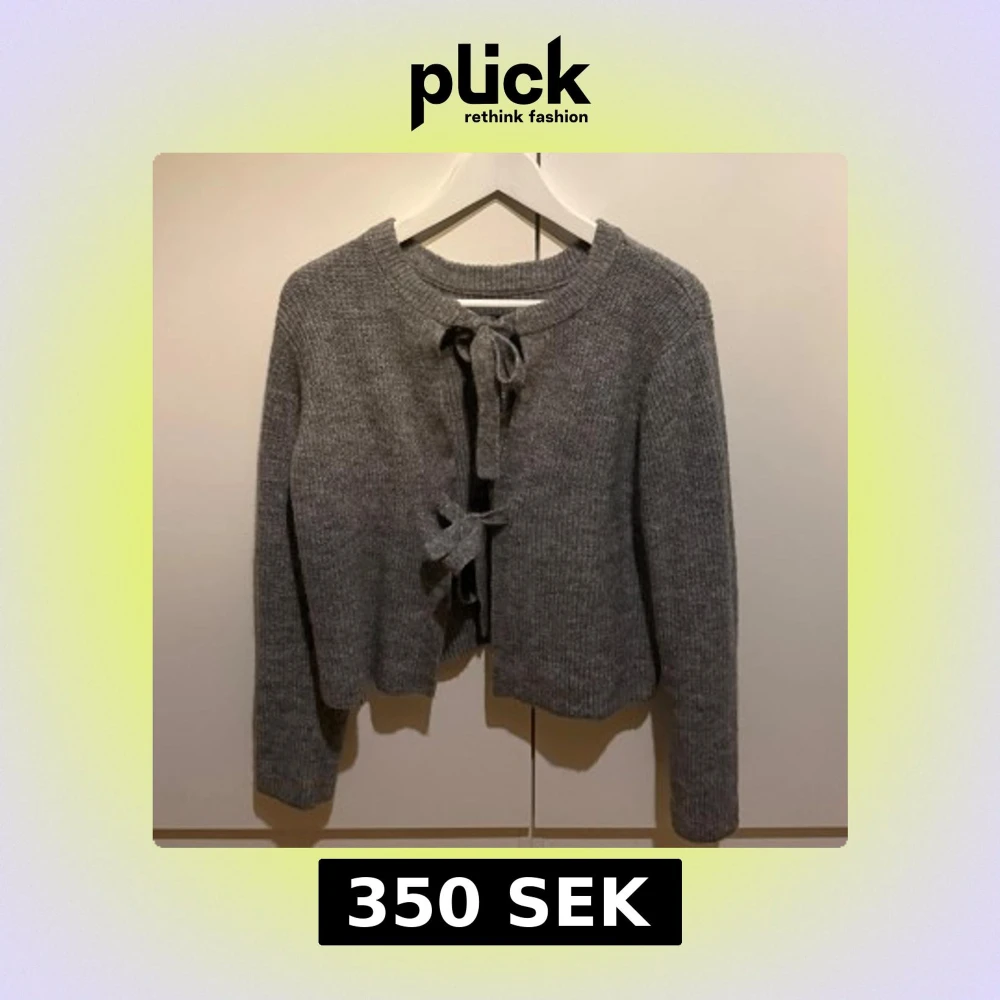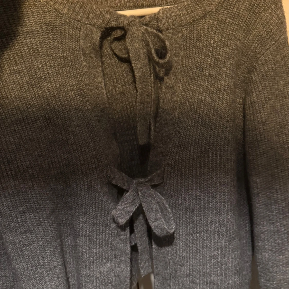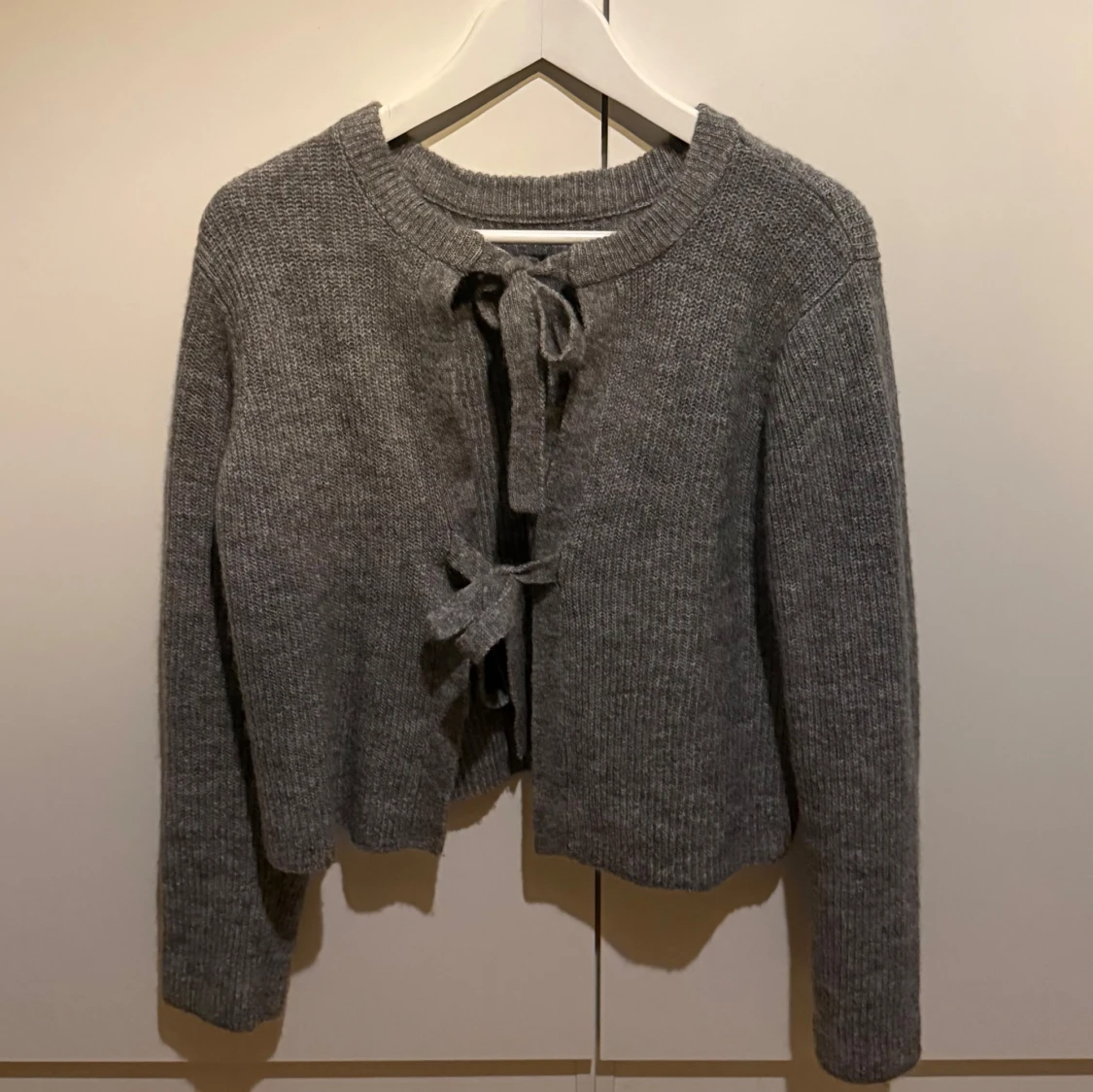 Grå stickad kofta med två knytband som man kan göra till rosetter framtill.