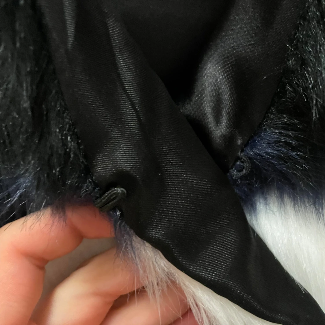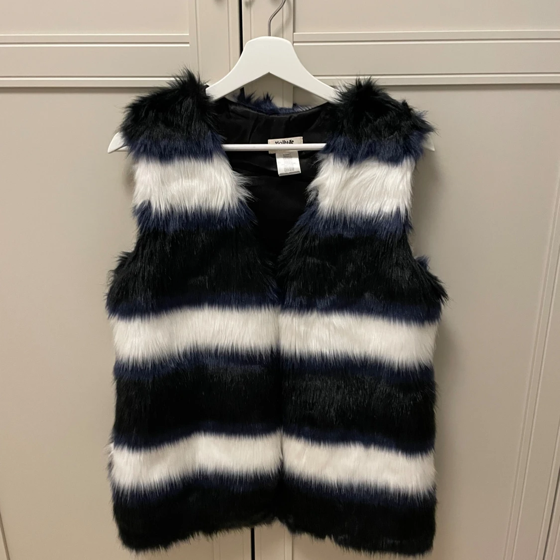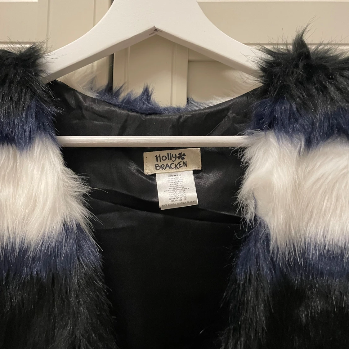 Fuskpäls, färgerna är vit, svart och blå.