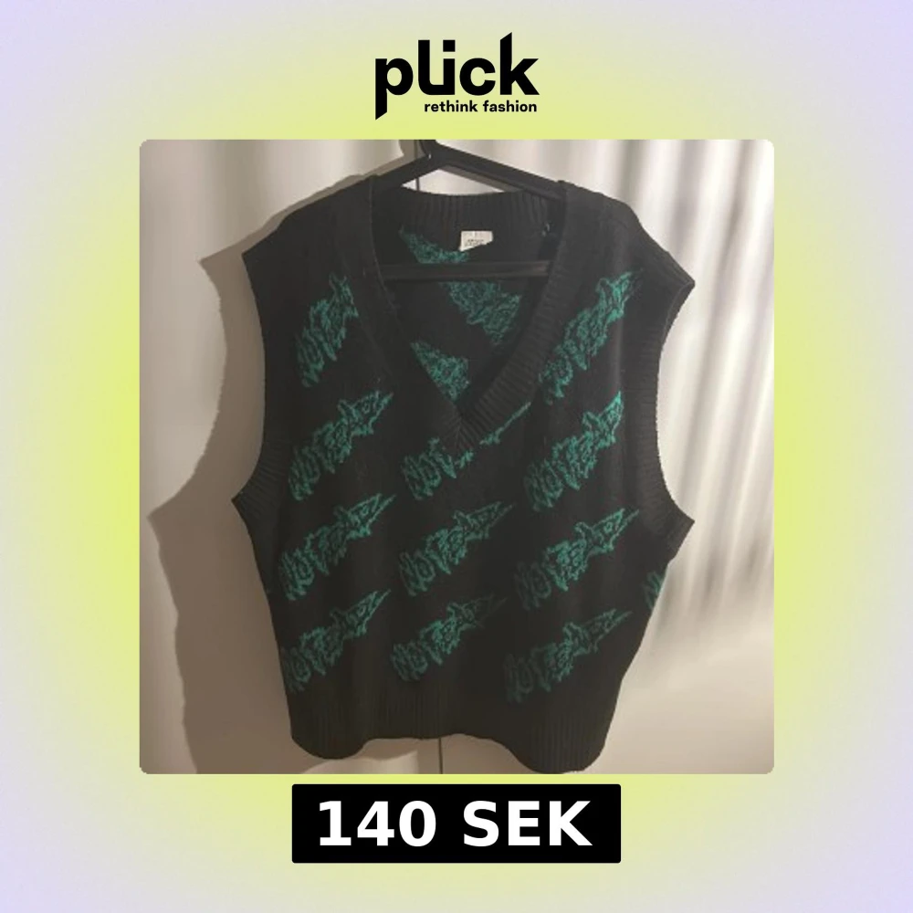 Svart stickad väst med grönt grafiskt mönster, djup v-ringning och oversized fit.