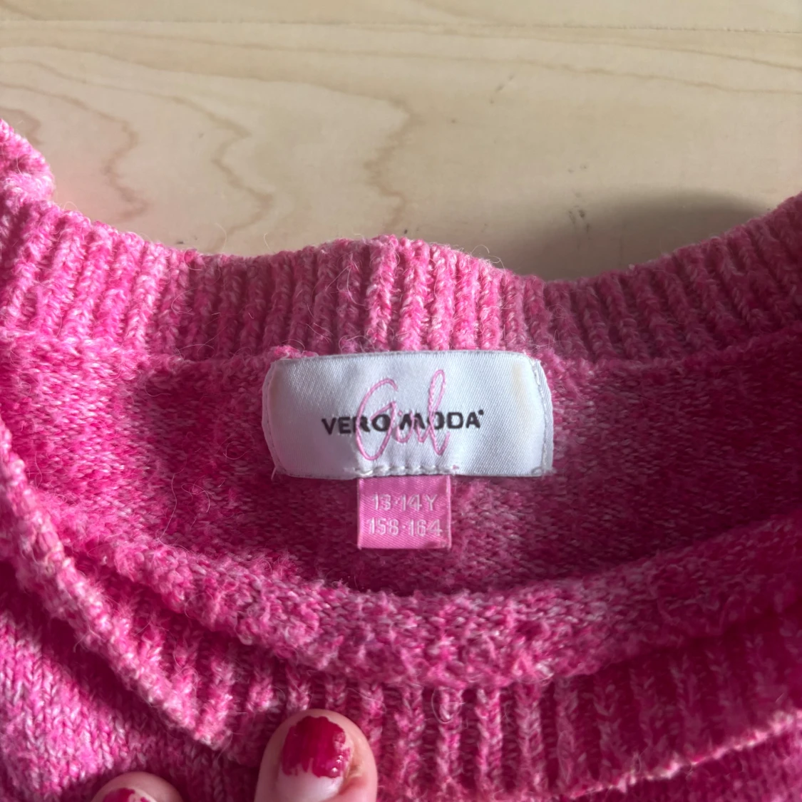 Mysig rosa stickad tröja från Vero Moda Girl med rund halsringning och ribbade muddar vid ärmslut och nederkant. Perfekt för lager-på-lager och enkel att matcha med jeans eller kjol.