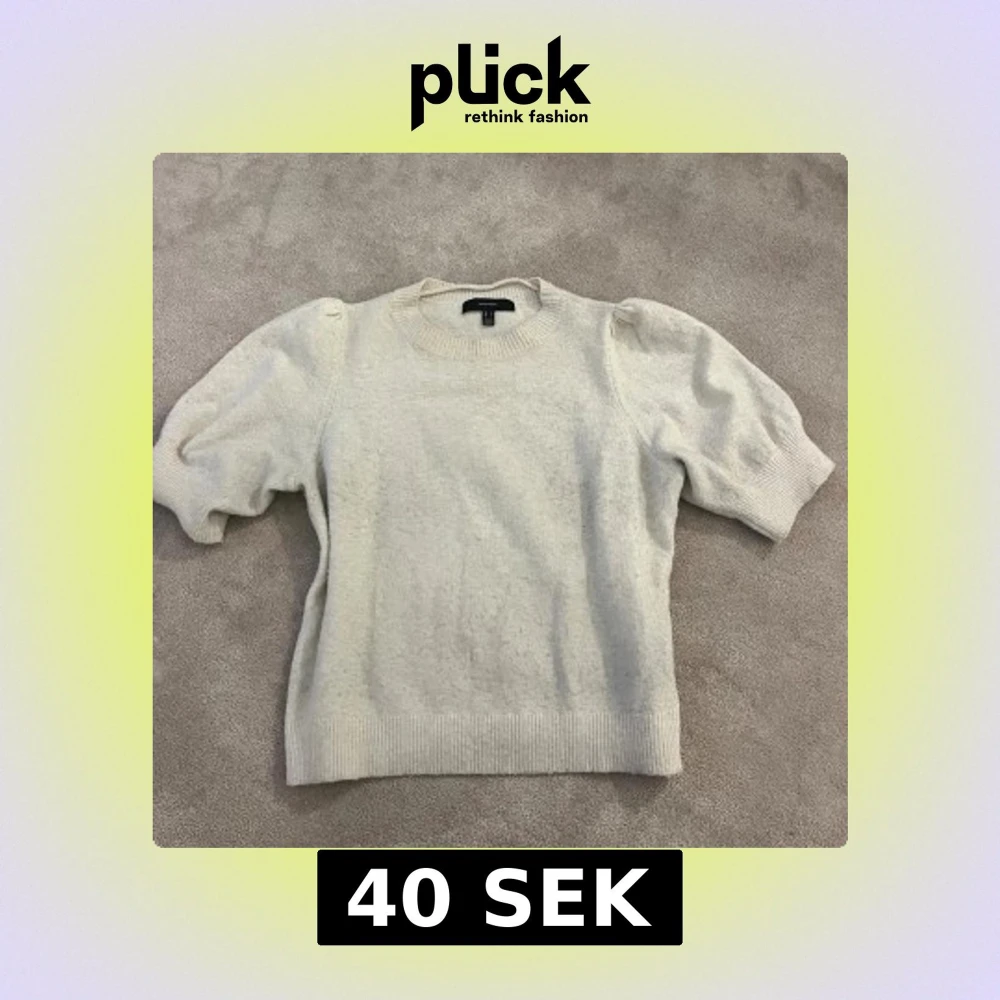 Beige stickad tröja från Vero Moda i storlek L. Tröjan har puffade korta ärmar och bred ribbad kant vid hals, ärmslut och nederkant. Liten brun fläck vid ena ärmen. Perfekt för dig som gillar mjuka och neutrala färger.