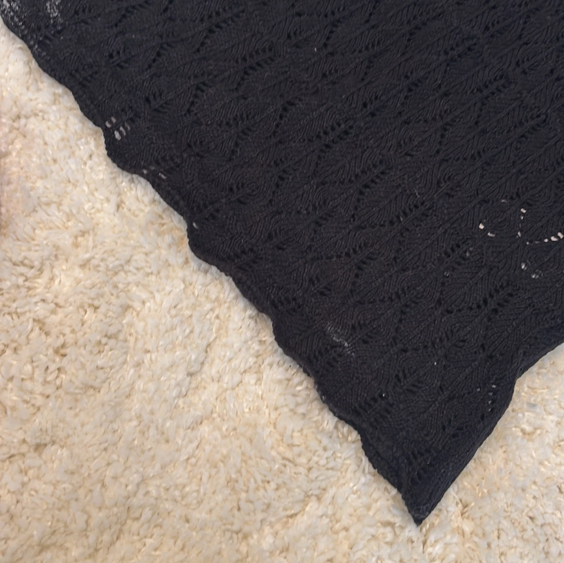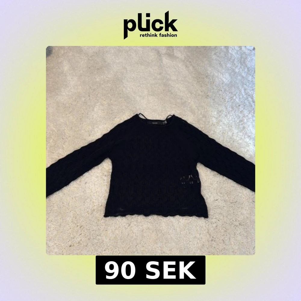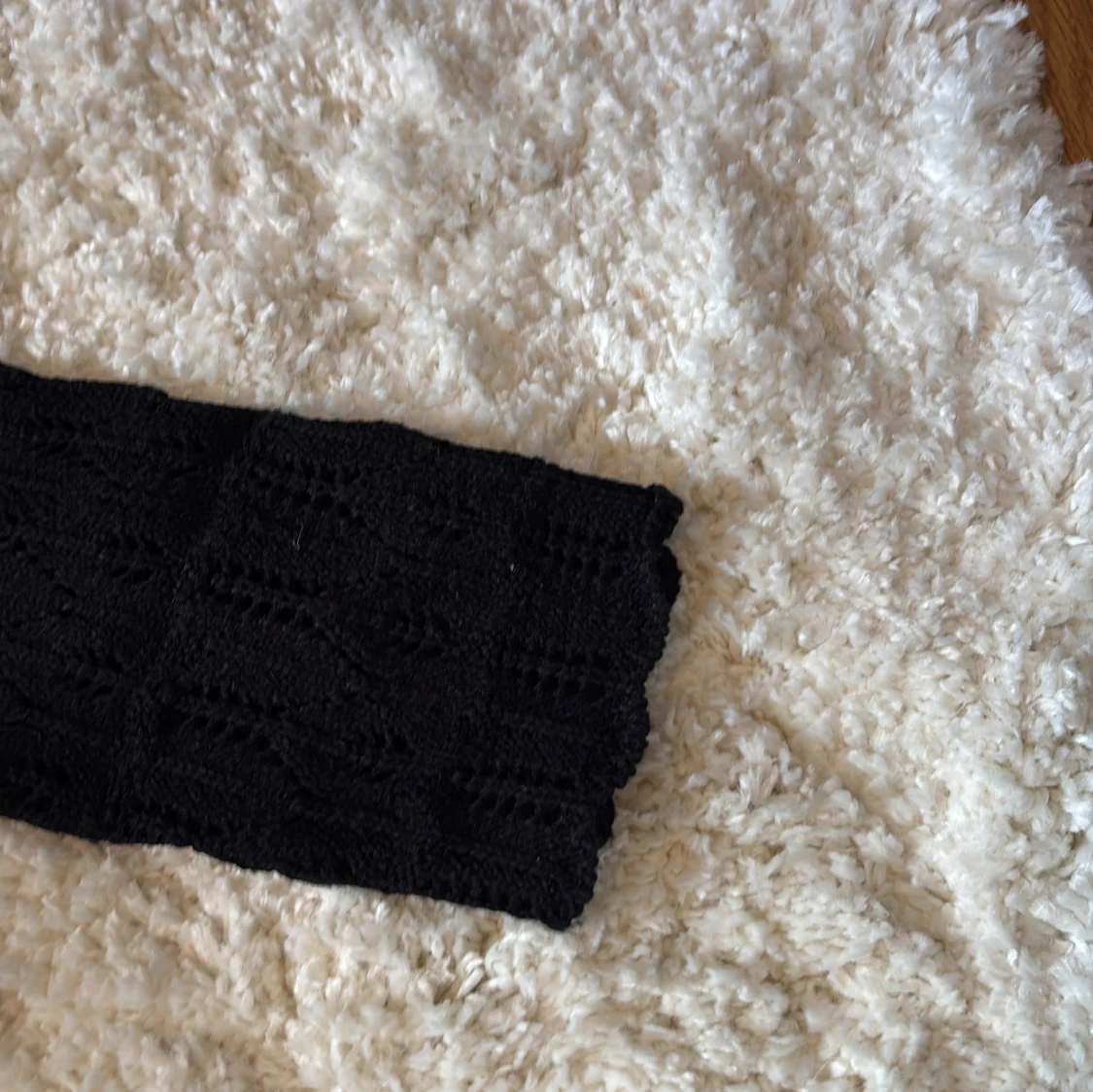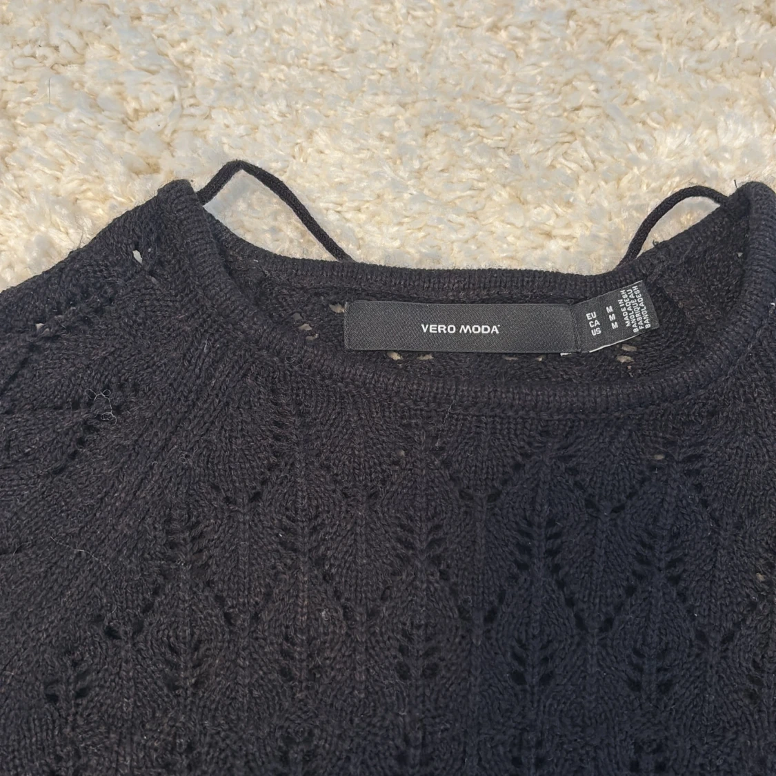Svart stickad tröja från Vero Moda med långärmad design och snyggt hålmönster. Tröjan har rund halsringning och vågig kant nertill och vid ärmslut. Liten i storleken. Aldrig använd