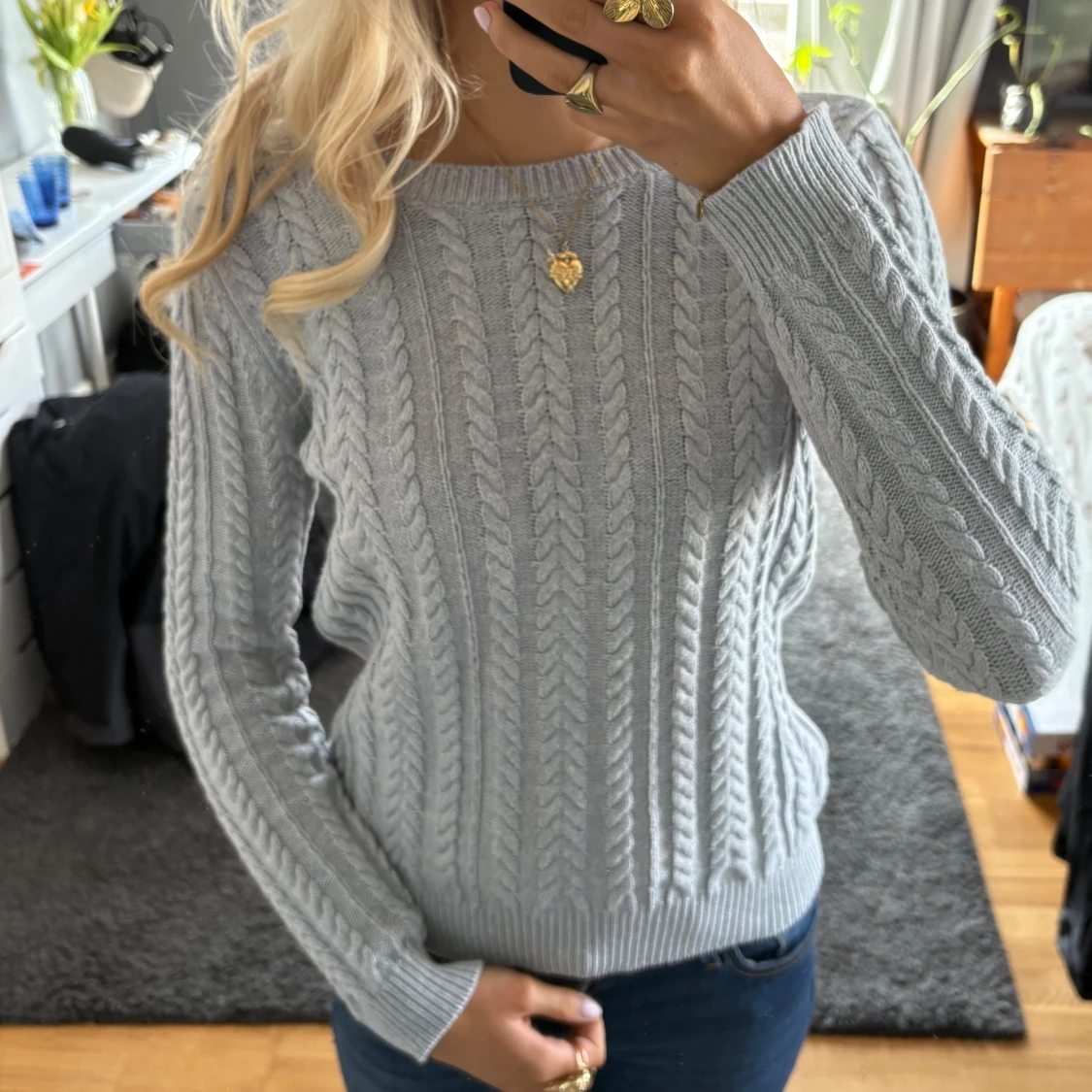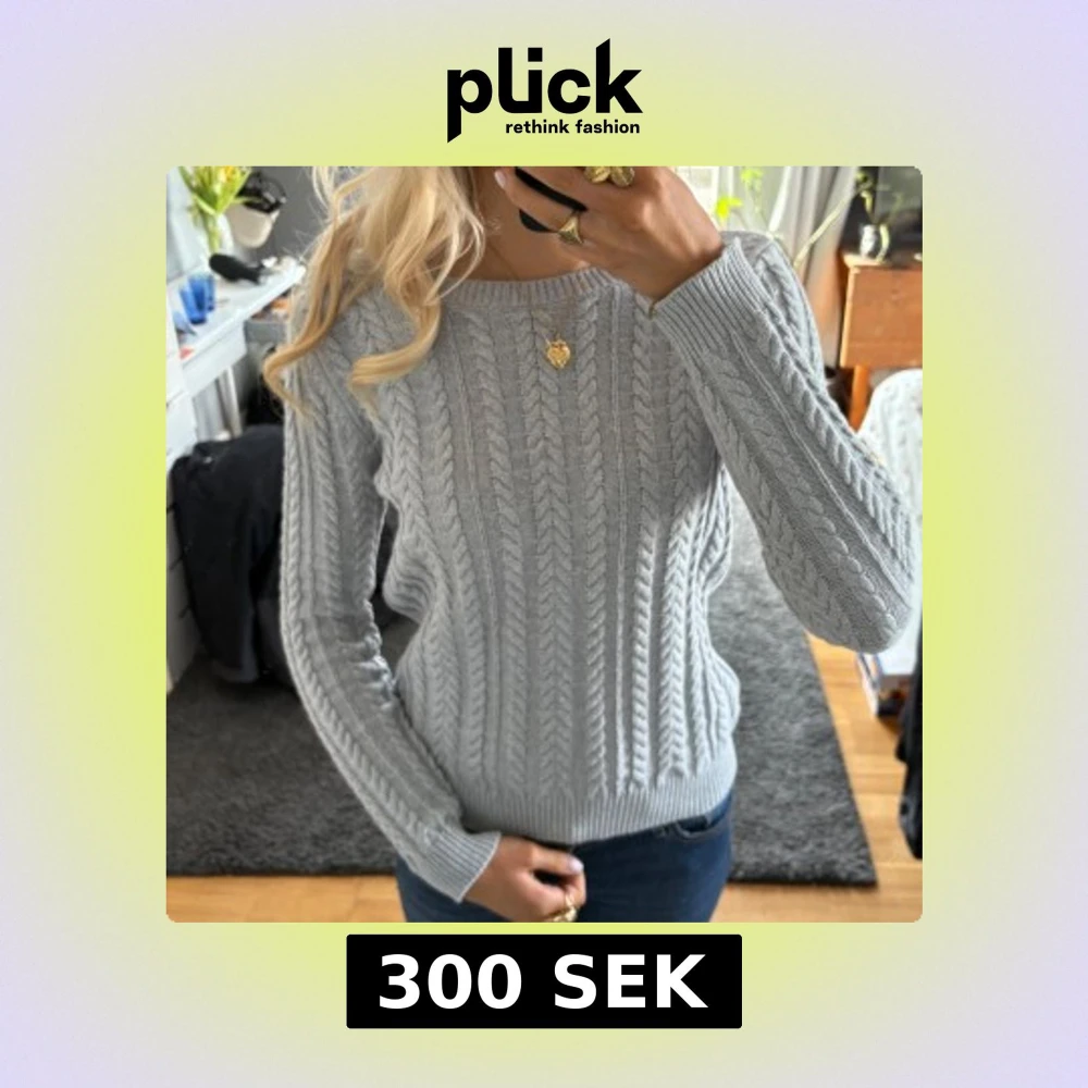 Säljer en stilren grå stickad tröja med flätmönster. Använd 3 gånger