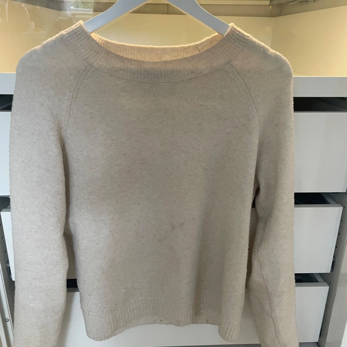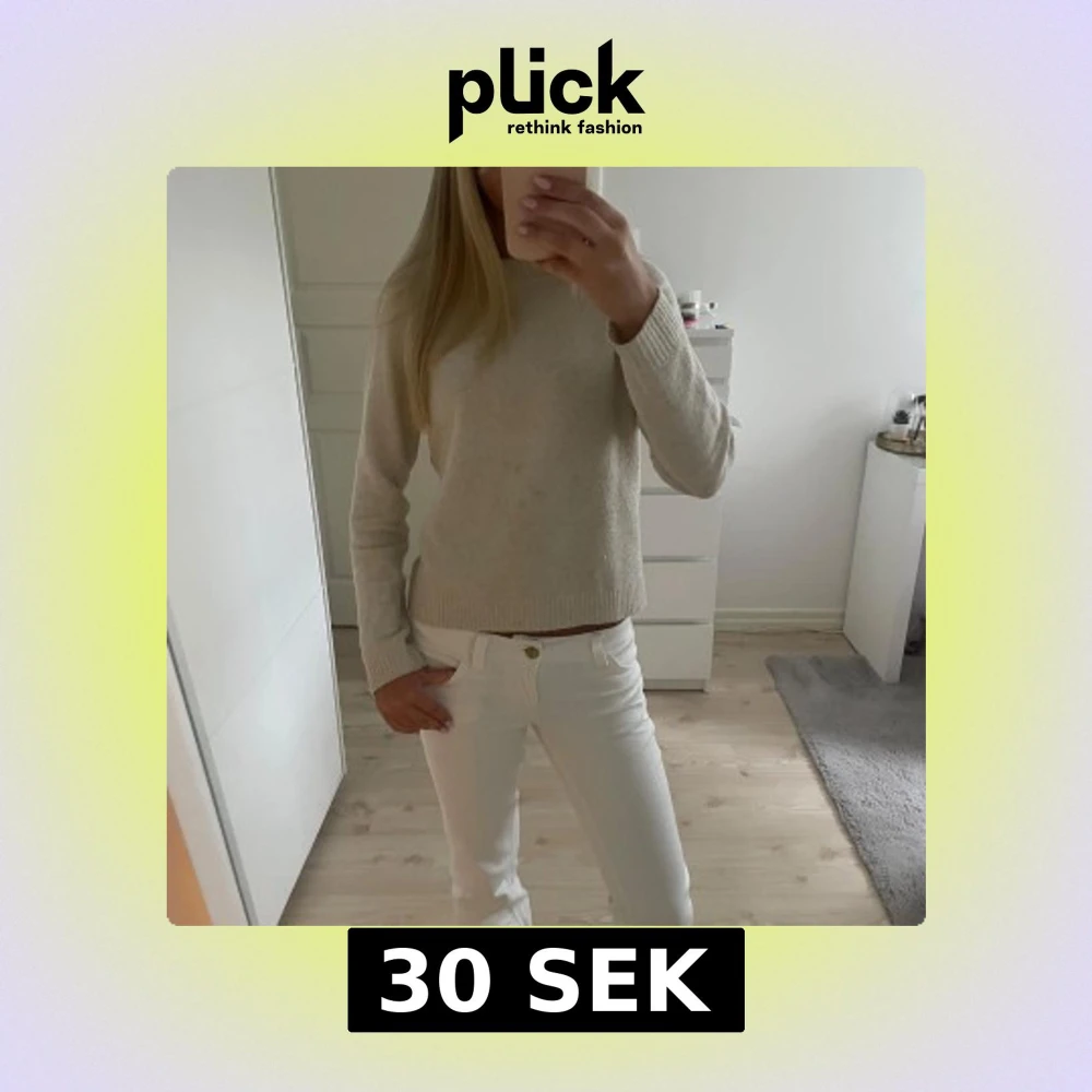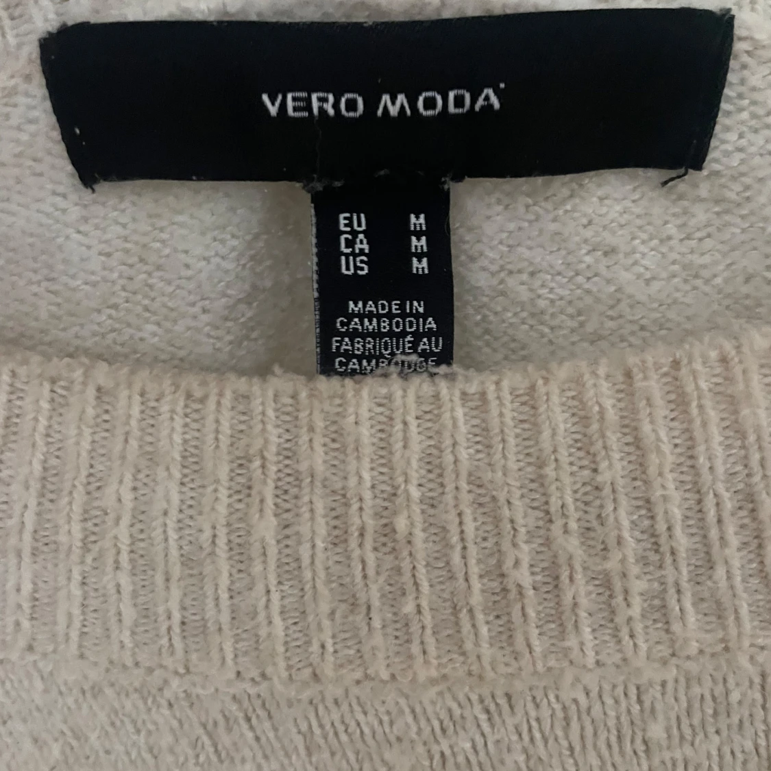 En stilren beige stickad tröja från Vero Moda i storlek M, men passar även S. Tröjan har rund halsringning, långa ärmar och ribbade muddar vid ärmslut och nederkant. Perfekt för lager-på-lager och enkel att matcha med jeans eller kjol. Har en fläck på magen (bild 3) annars i bra skick!