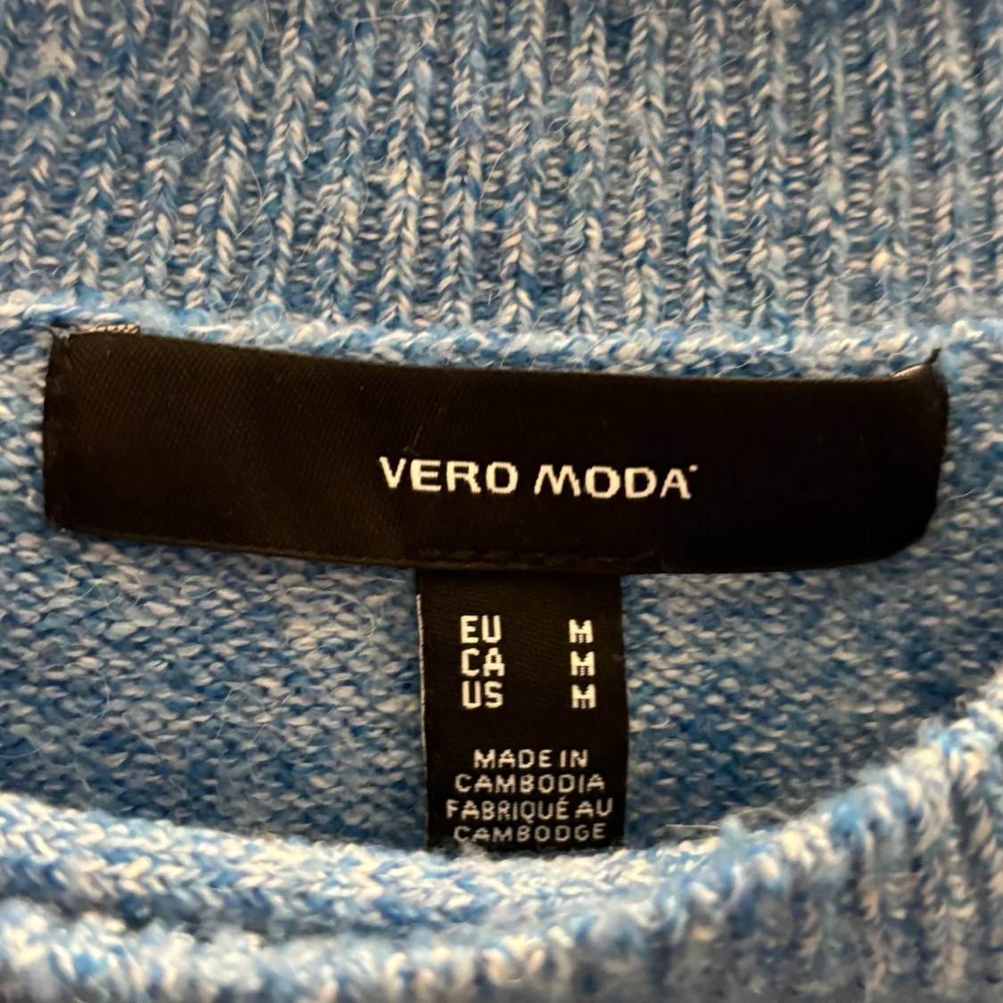 Säljer en mysig blå stickad tröja från Vero Moda. Tröjan har en rund halsringning och långa ärmar, perfekt för kyligare dagar. Den är mjuk och bekväm, idealisk för både vardag och avslappnade tillfällen.