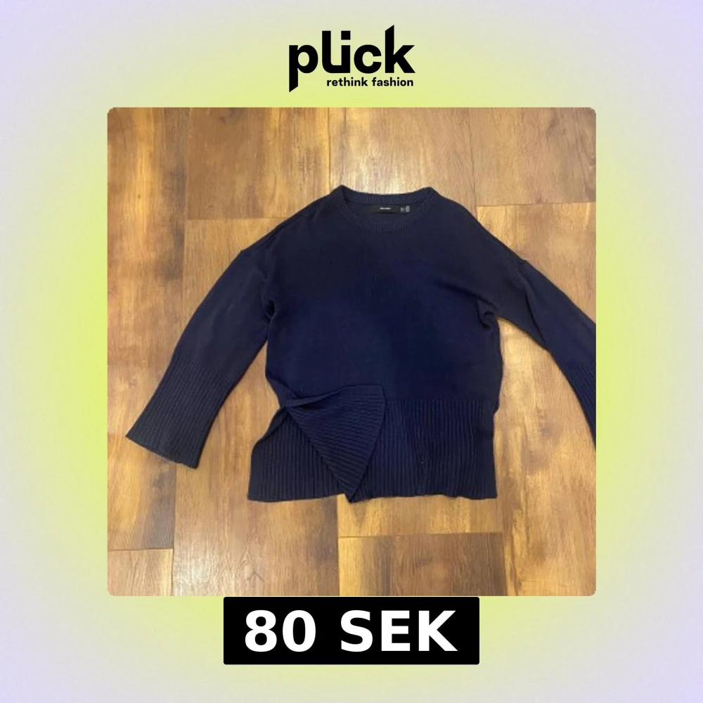 Säljer en mörkblå stickad tröja från Vero Moda med bred ribbad mudd och snygg omlottdetalj i nederkant. Tröjan har långärmade ärmar och en klassisk rund halsringning. Perfekt för dig som gillar stilrena och trendiga plagg.