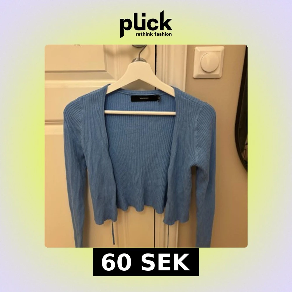Säljer en ljusblå ribbad kofta från Vero Moda i storlek S. Koftan är croppad med långa ärmar och har en öppen front med tunna knytband. Koftan är kort i modellen. Aldrig använd, alltså inga skador💓Köparen står för frakten