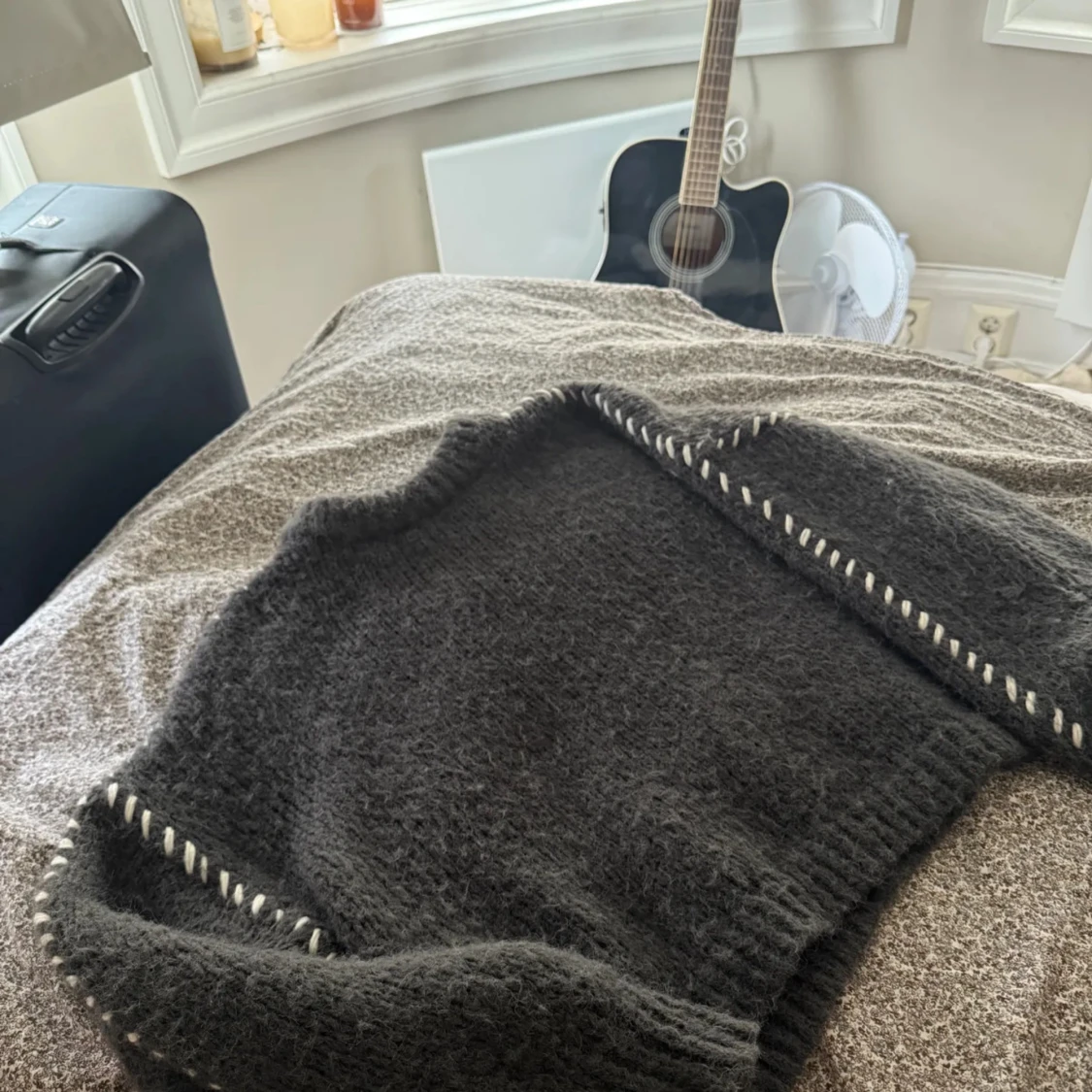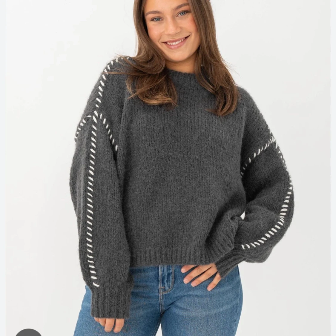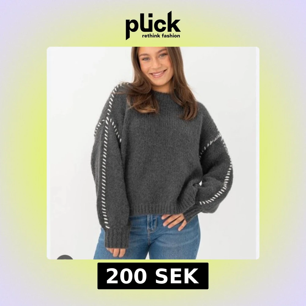 Mysig mörkgrå stickad tröja med oversized passform och långa ärmar. Tröjan har vita dekorativa sömmar längs ärmarna och ribbade muddar vid ärmslut och nederkant.