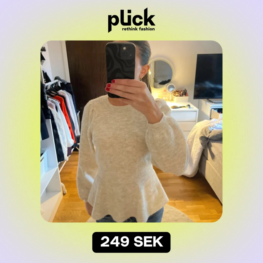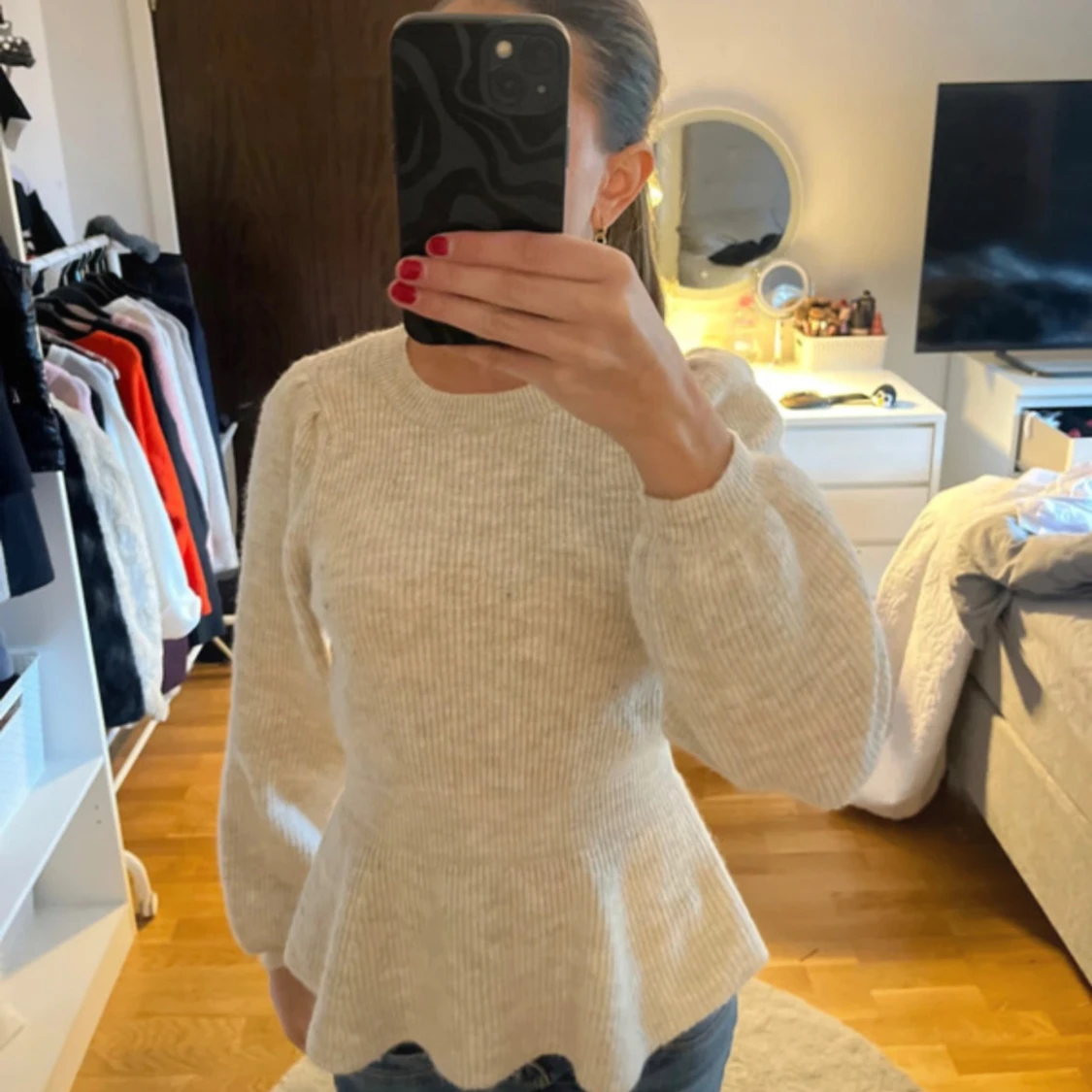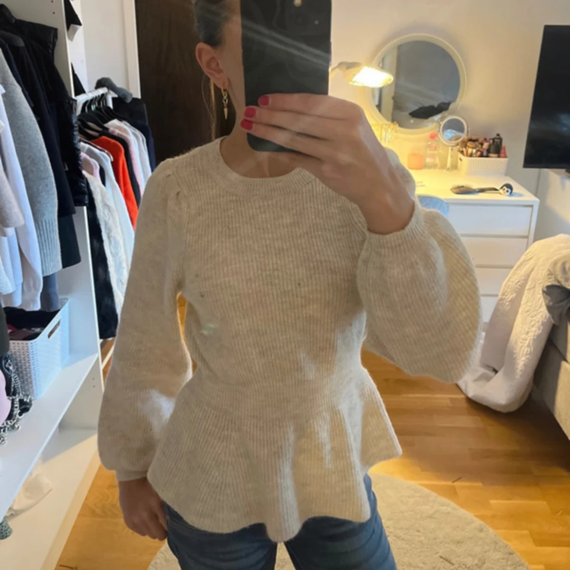 Säljer en superfin beige stickad tröja från vero Moda. Den har en snygg volangdetalj i midjan som ger en feminin touch. Tröjan är långärmad och perfekt för höst och vinter. Den är i mycket bra skick och passar både till vardags och fest. Perfekt att matcha med jeans eller kjol!