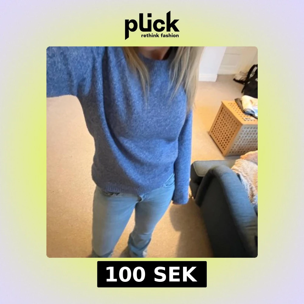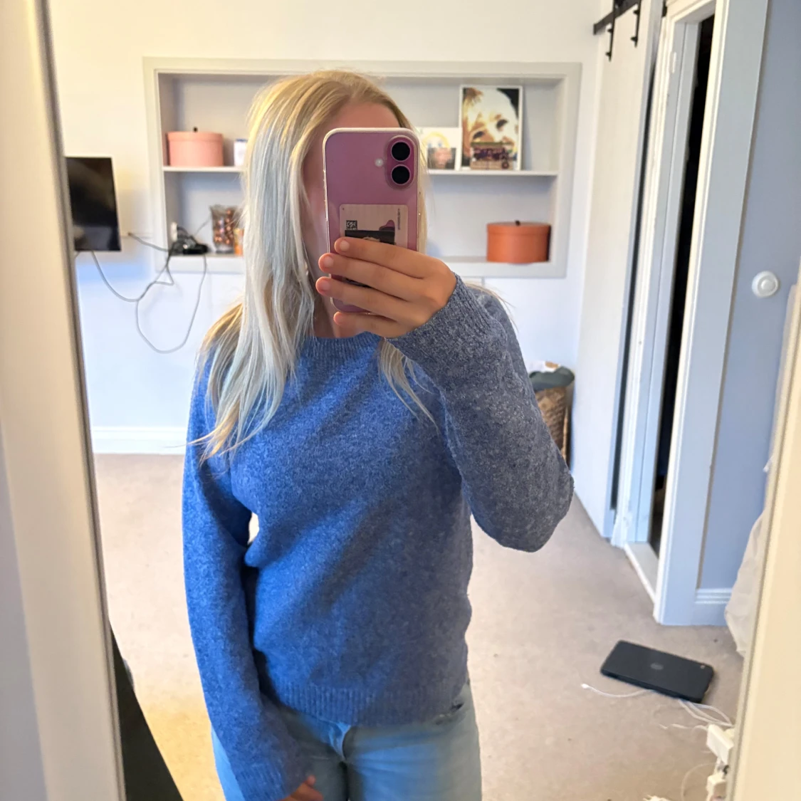 Mysig blå stickad tröja med rund halsringning och långa ärmar. Perfekt för kyligare dagar och enkel att matcha med jeans eller kjol. Fint skick och priset går att diskutera💞