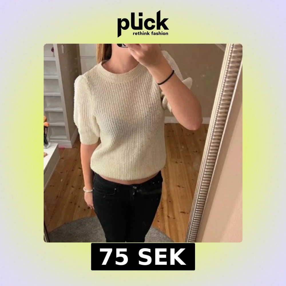 Säljer en stilren vit stickad tröja med korta ärmar. Perfekt för en avslappnad look. Tröjan har en rund halsringning och är gjord i ett mjukt material.