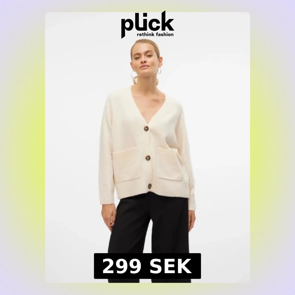 Säljer en beige kofta med djup v-ringning, stora bruna knappar och två rejäla fickor framtill. Koftan har lång ärm och är stickad i mjukt material, perfekt för lager-på-lager. Enkel och clean look som funkar till många stilar.