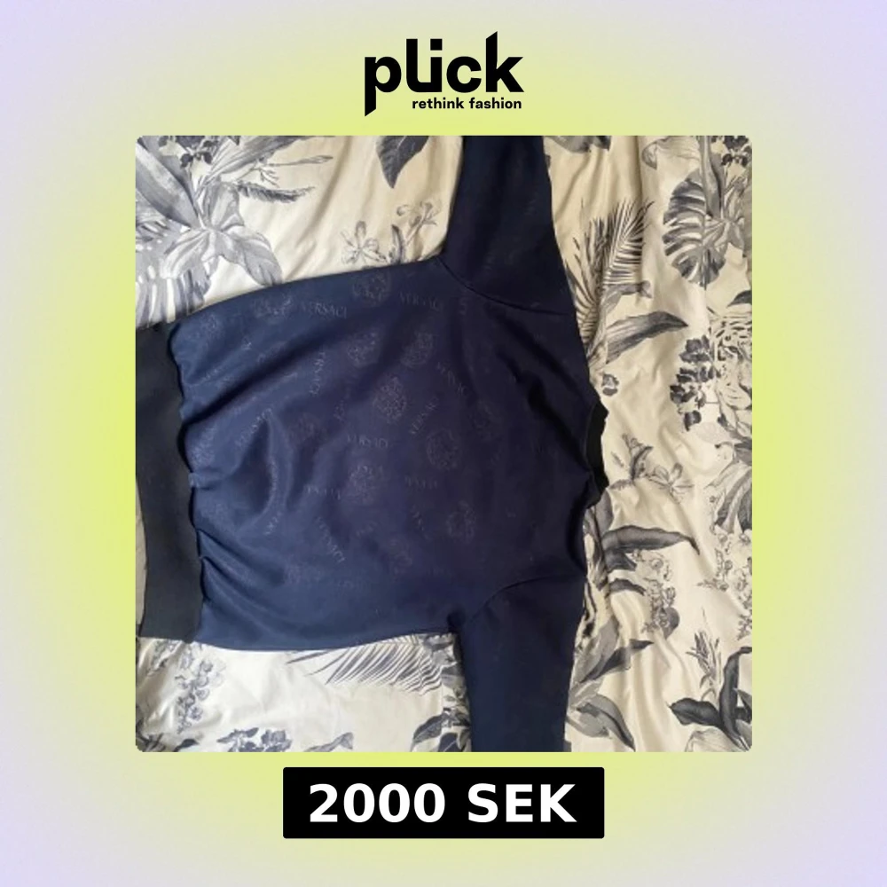 Säljer en mörkblå sweatshirt från Versace med diskret mönster och stor broderad Medusa-logga på bröstet. Tröjan har rund hals, långa ärmar och svarta ribbade muddar vid ärmslut och midja. Perfekt för dig som gillar exklusiva streetwear-vibbar.