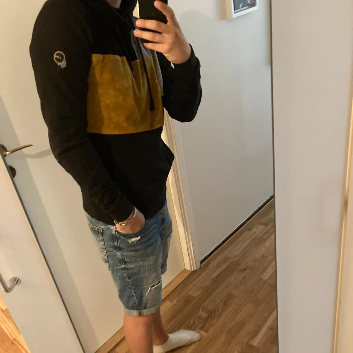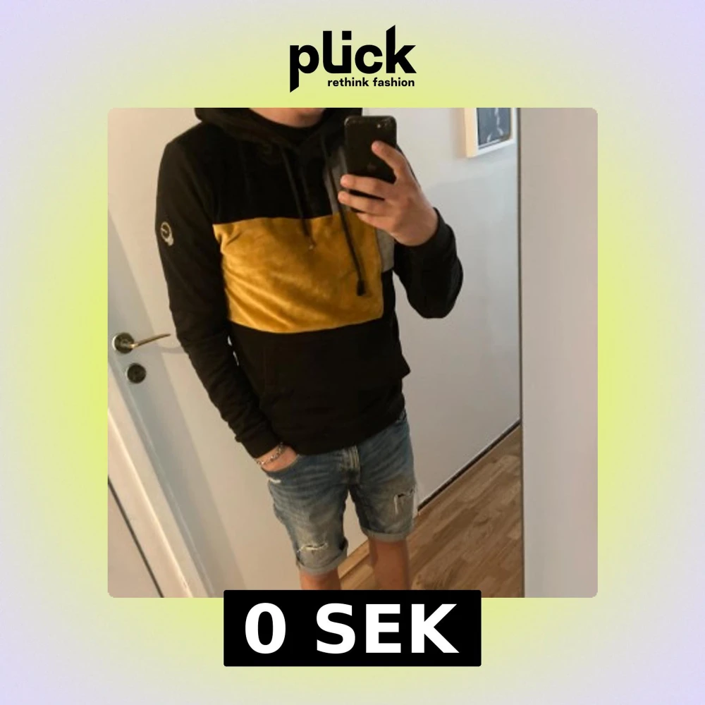 Säljer en Vichy hoodie med bred gul panel över bröstet och snörning i huvan. Tröjan har lång ärm, känguruficka och en liten logga på ärmen. Perfekt för dig som gillar streetstyle och vill sticka ut med färg.