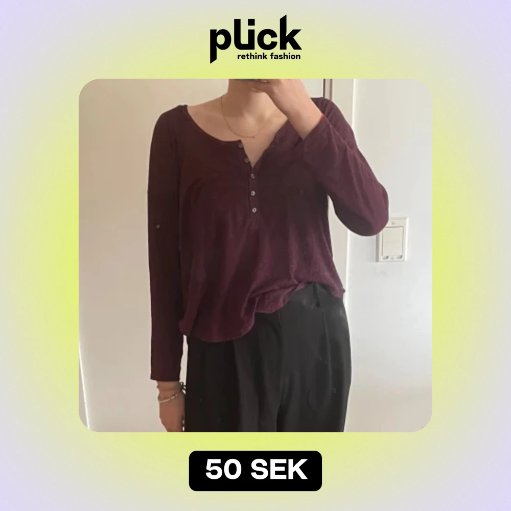 Storlek 38, sitter löst på kroppen. En lila långärmad tröja med 5 knappar där fram. Inga defekter