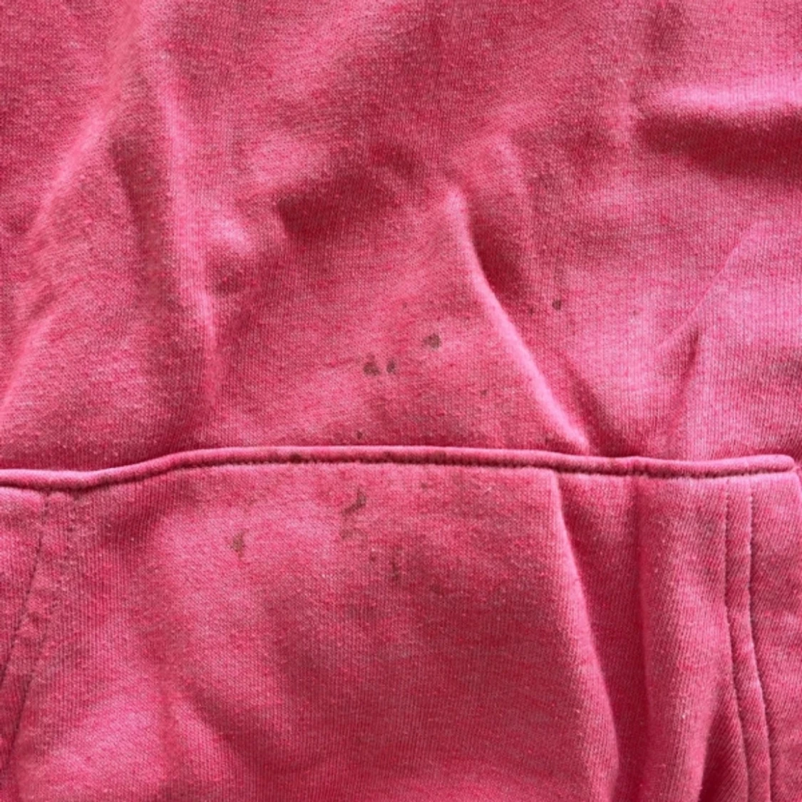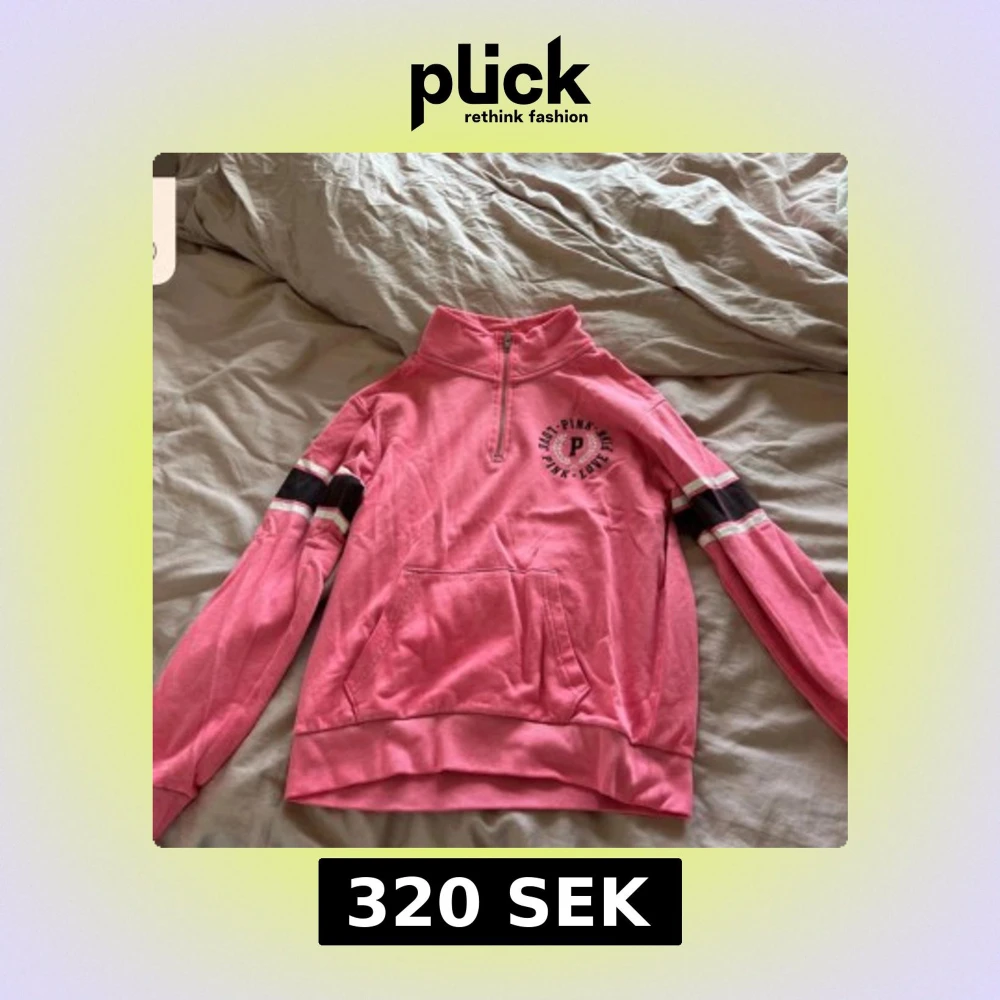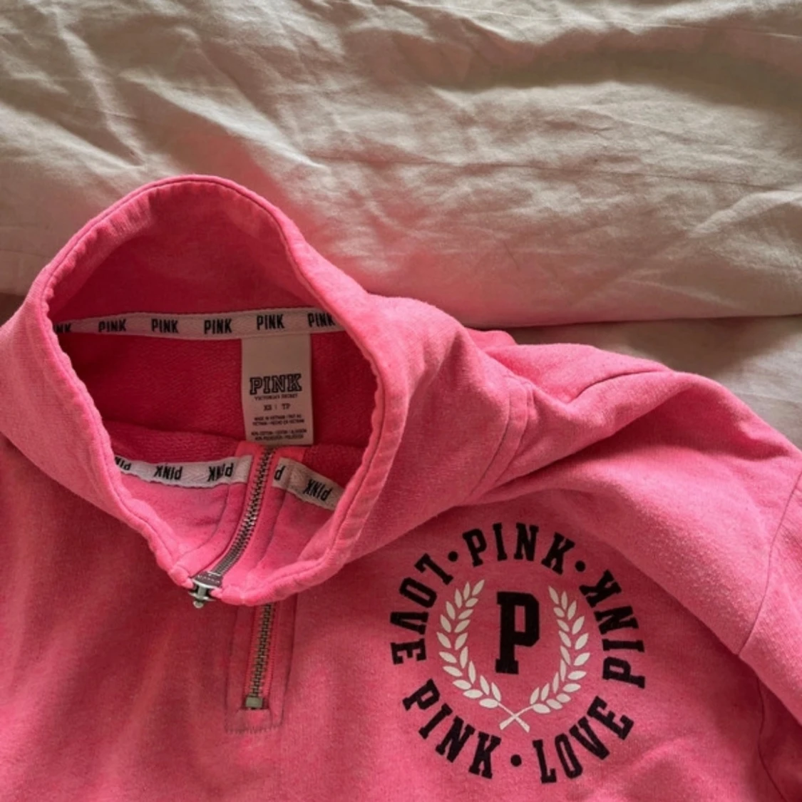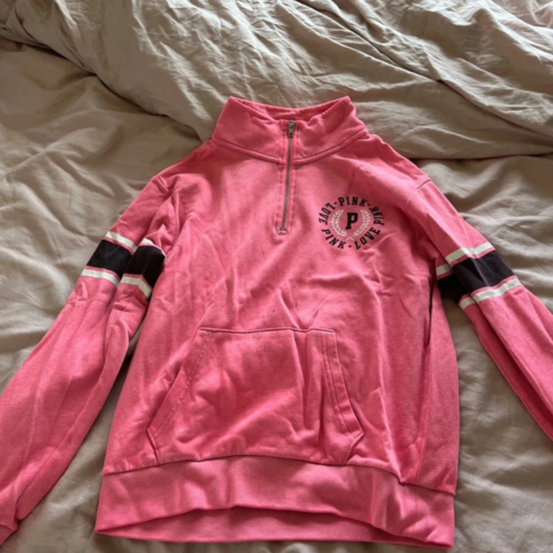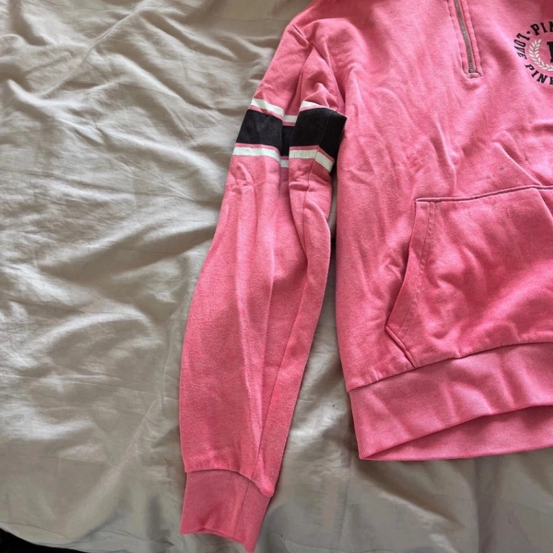 Rosa hoodie från Victoria Secret med svart och vit logga på bröstet, svarta och vita ränder på ärmarna och praktisk känguruficka. Tröjan har half zip-dragkedja och hög krage. Perfekt för chill dagar eller när du vill ha en sportig look.