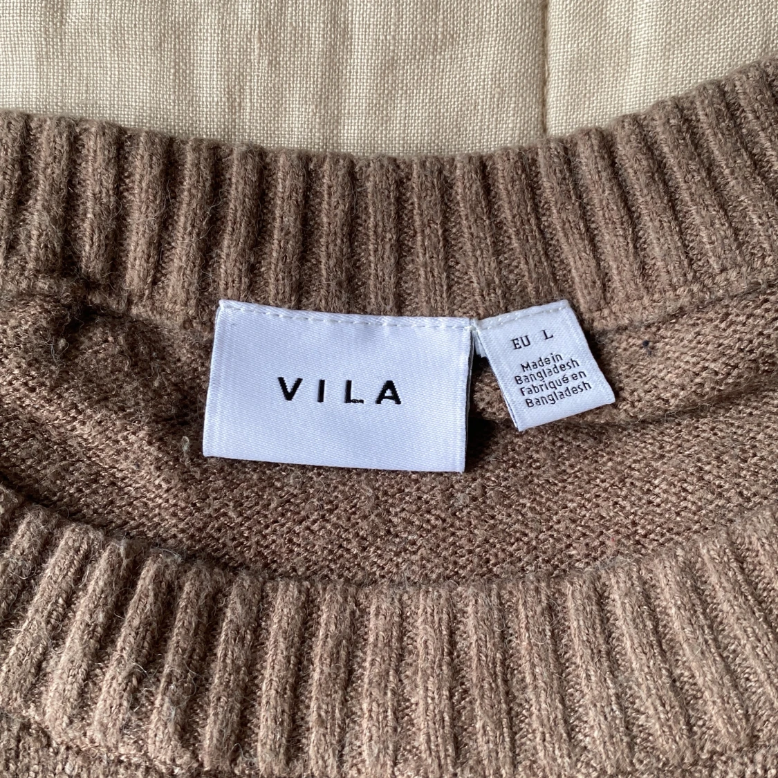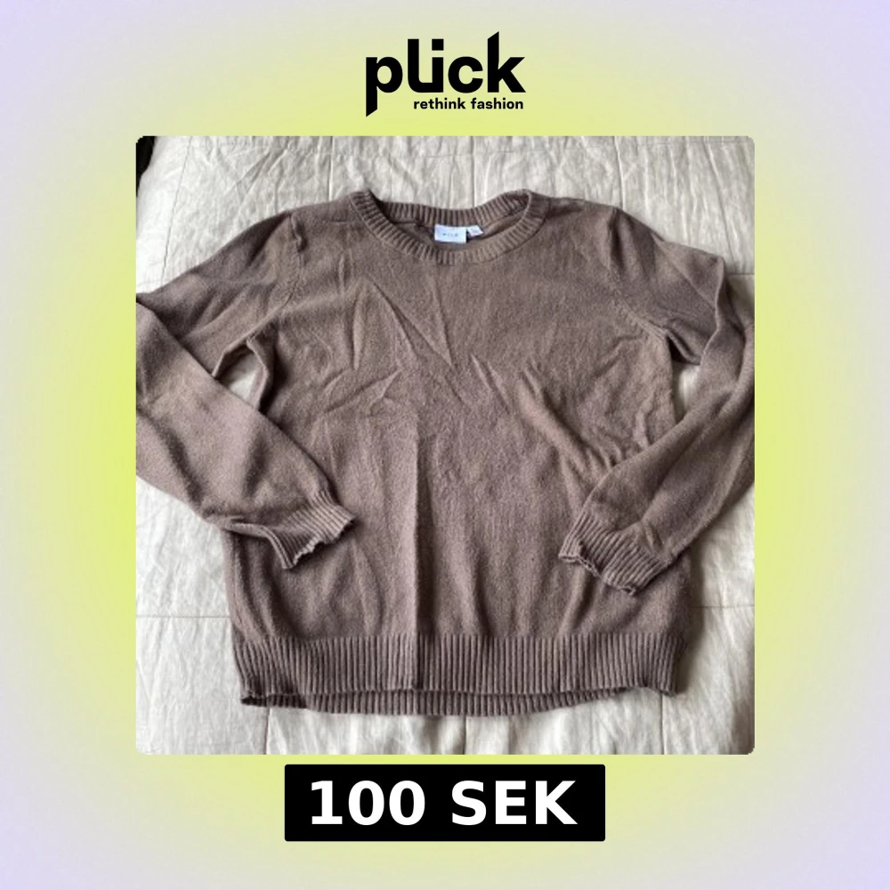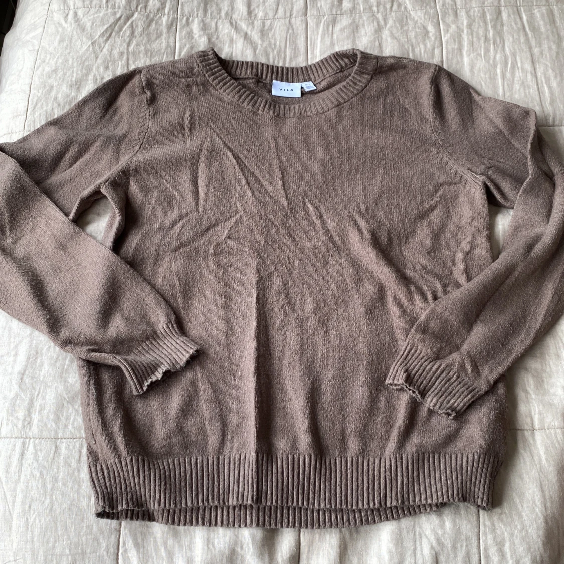 Mysig brun stickad tröja från VILA i storlek L. Tröjan har rund halsringning, långa ärmar och breda ribbade muddar vid ärmslut och nederkant. Nopprig.