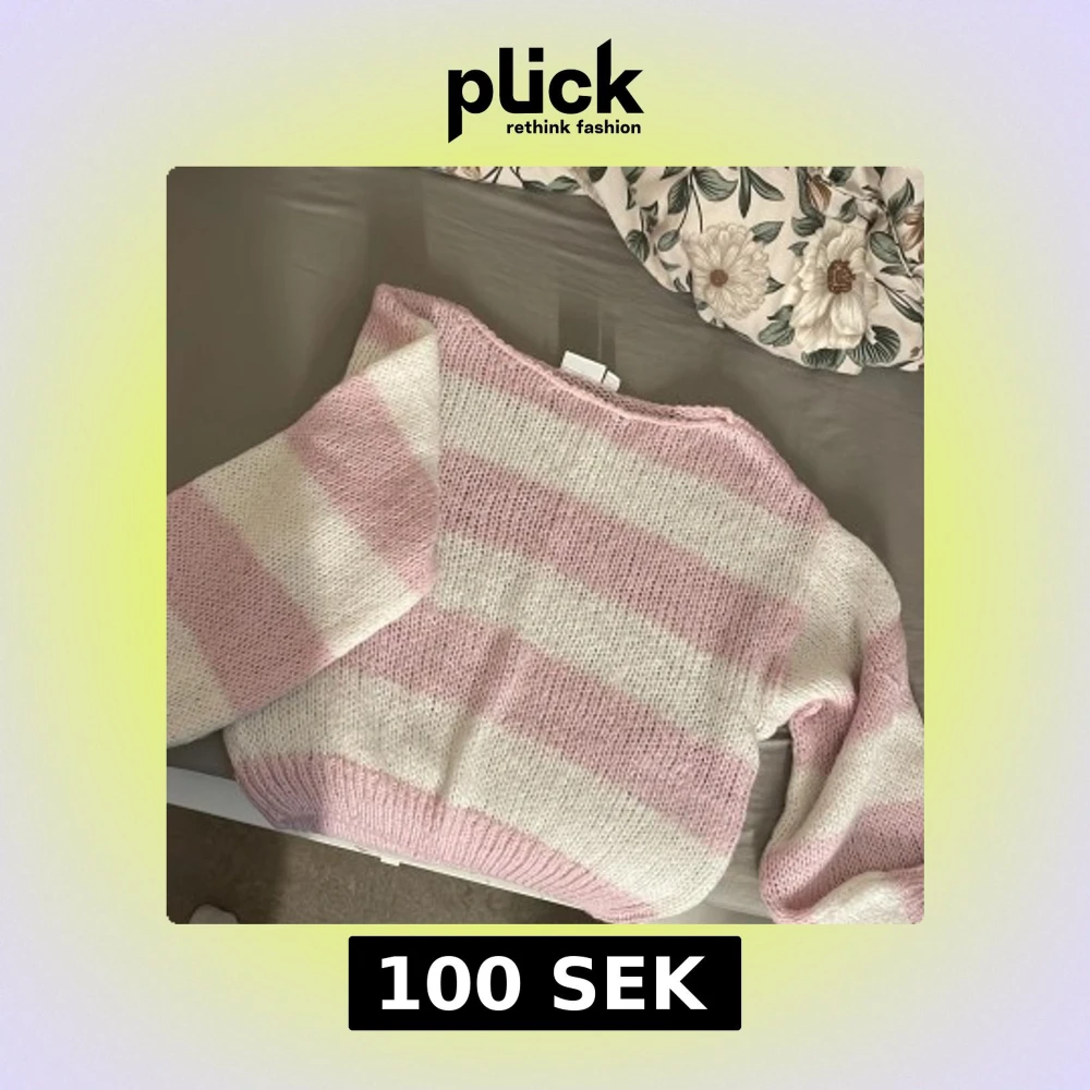 Supermysig stickad tröja med breda rosa och vita ränder. Tröjan har en loose passform och långa ärmar, perfekt för att hålla sig varm under kyliga dagar. Den har en klassisk rund halsringning och är riktigt mjuk och skön att ha på sig.