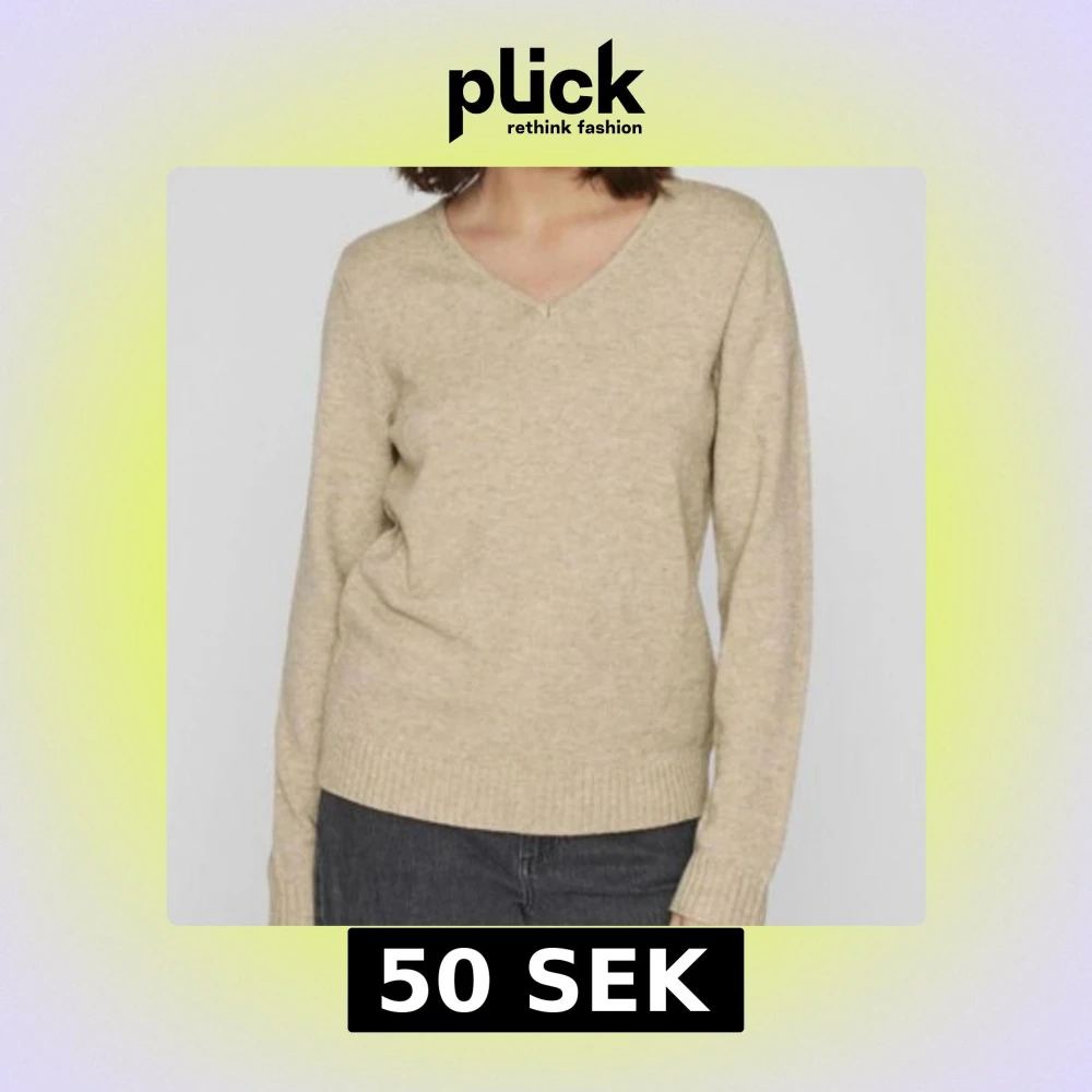 GARDEROBSRENSNING! En stilren beige stickad tröja med v-ringning och långa ärmar. Tröjan har ribbade muddar vid ärmslut och nederkant, vilket ger en snygg och enkel look. Perfekt att matcha med jeans eller kjol för en chill vibe.