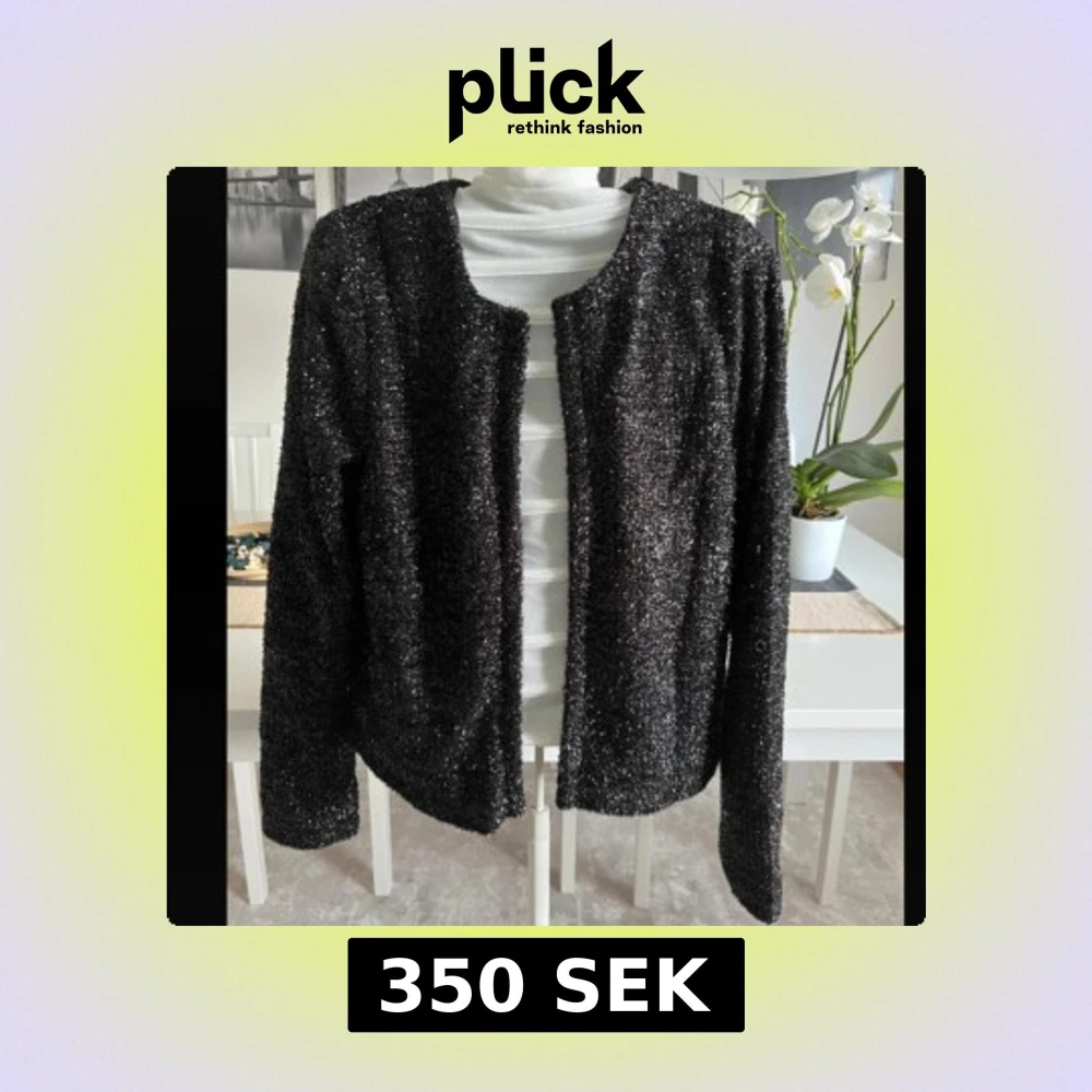 Säljer en svart glittrig kofta från Vila i storlek S. Koftan har lång ärm, öppen framtill och är tillverkad i ett glittrigt, mjukt material som ger en festlig känsla. Perfekt att slänga över en topp för att lyfta din look.