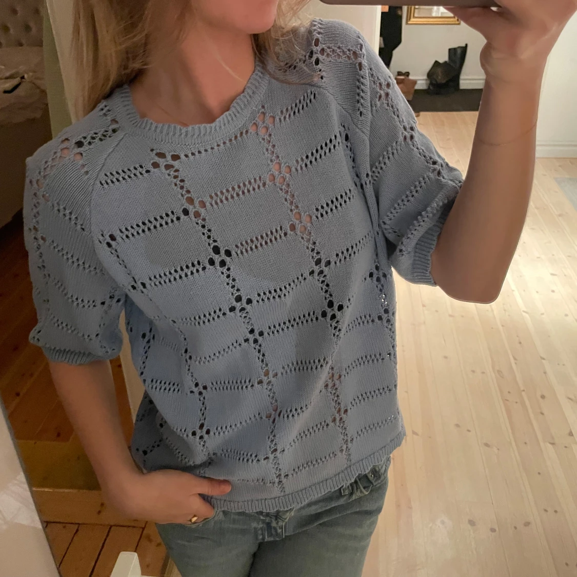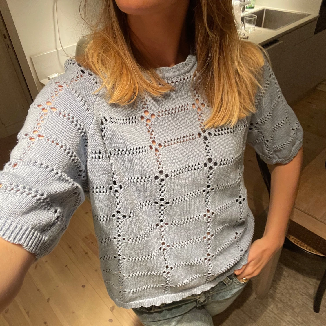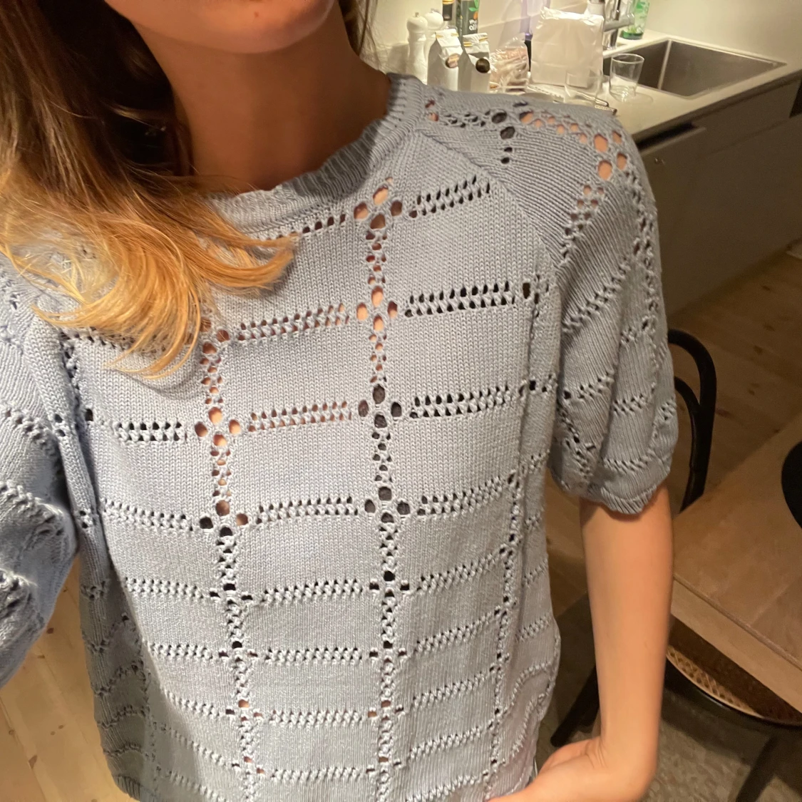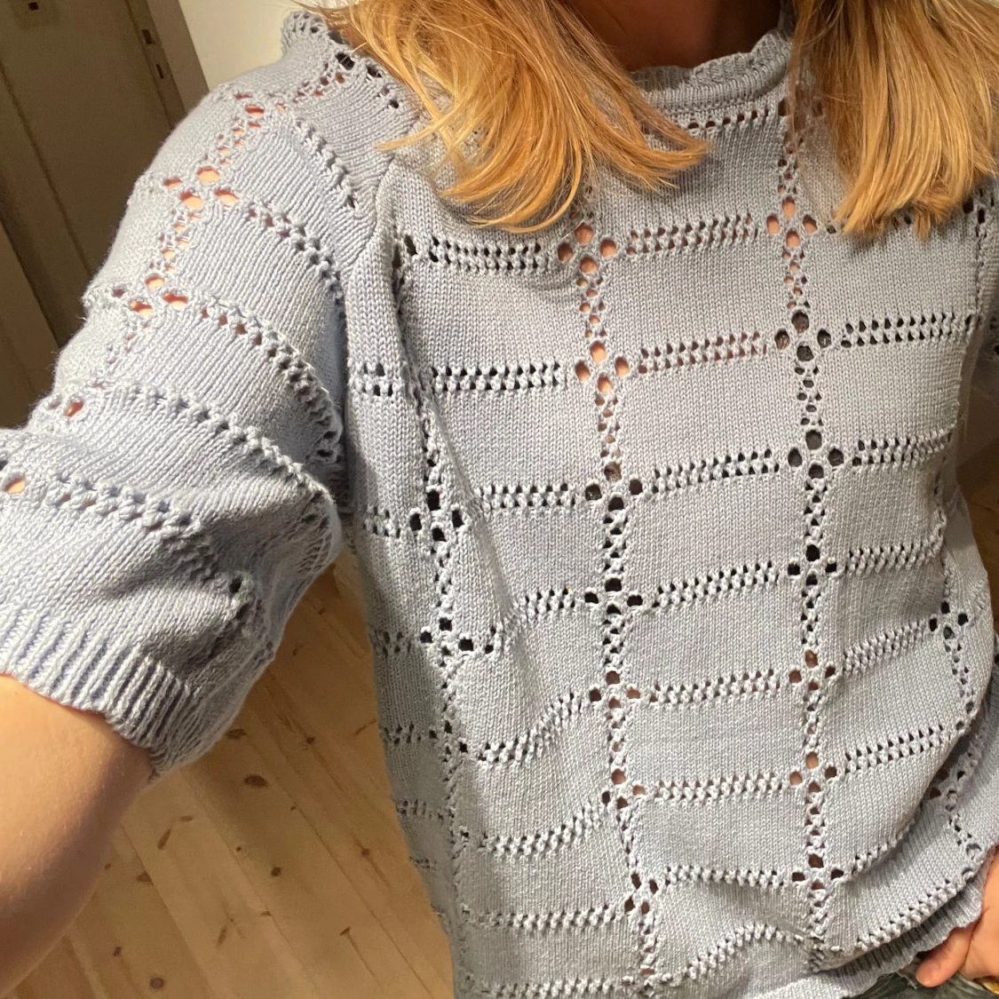 Säljer en ljusblå stickad tröja med ett snyggt mönster. Tröjan har korta ärmar och en avslappnad passform, perfekt för vår och sommar. Den är både stilren och bekväm, ett måste i garderoben! 💙