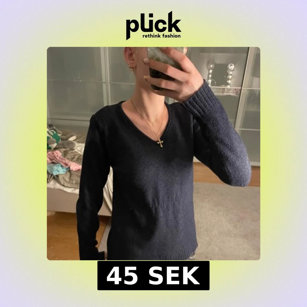 Säljer en stilren mörkblå tröja med v-ringning. Den är rätt så använd, den har alltså inte kvar samma mjuka material som när den var ny.