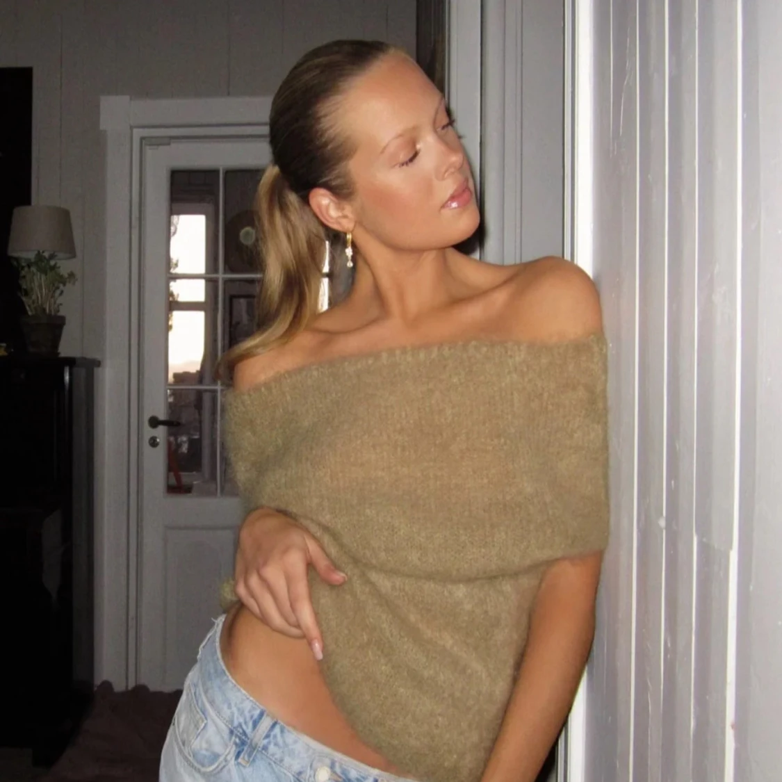 Supermysig beige stickad tröja med offshoulder-design som ger en chill och trendig vibe. Tröjan har en loose passform och är perfekt att styla med jeans eller kjol. Materialet är fluffigt och mjukt, vilket gör den extra skön att bära under svalare dagar.