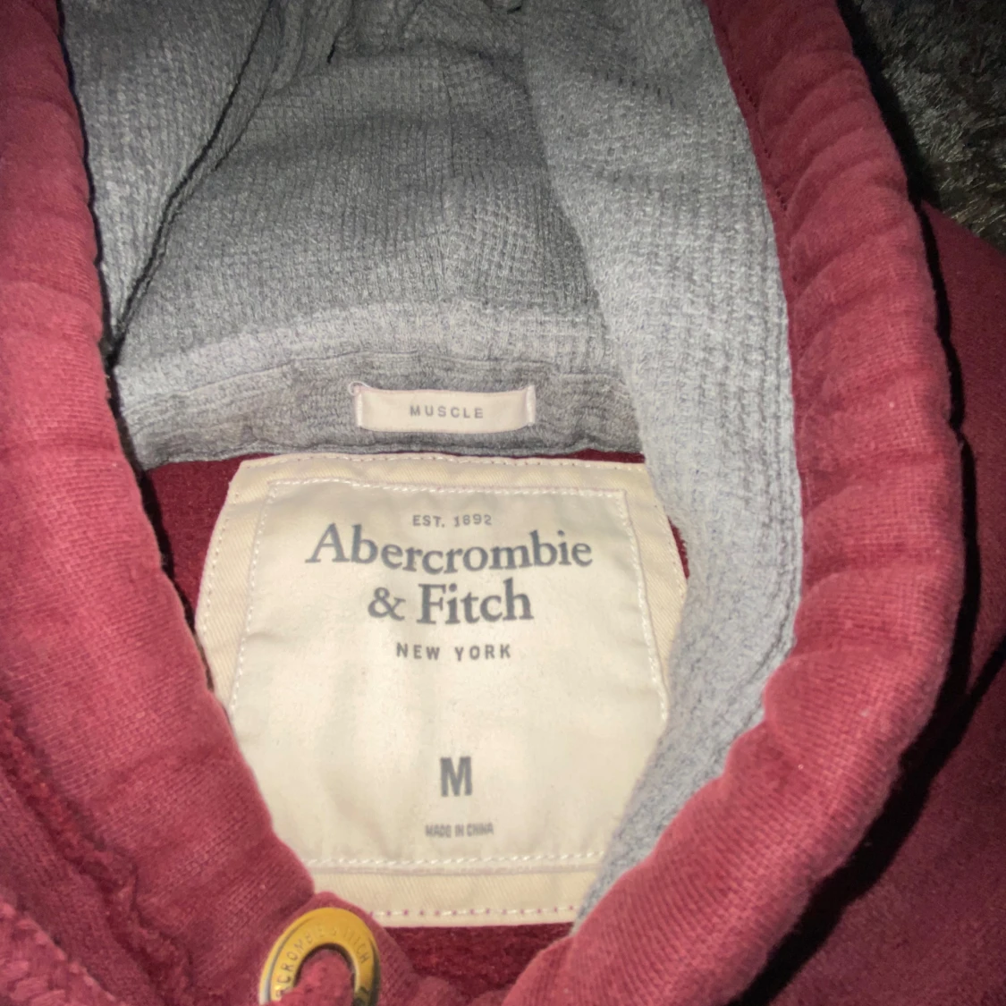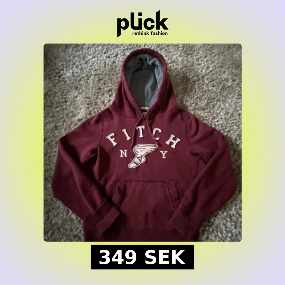 Snygg vinröd hoodie från Abercrombie & Fitch med broderad logga och text på bröstet. Tröjan har huva med grått foder, snörning och klassisk känguruficka. Perfekt för chill dagar och streetstyle. Har du några funderingar så är det bara att skriva.
