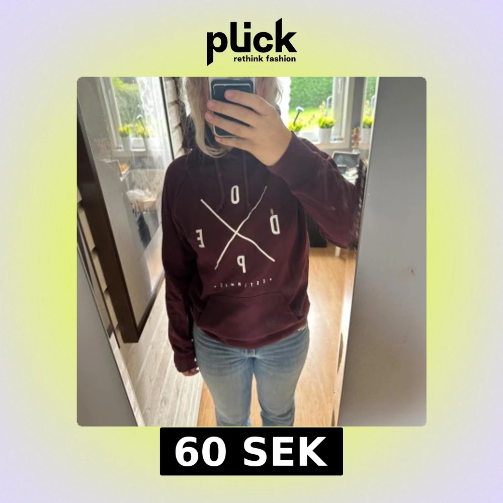 Säljer en vinröd hoodie från Dope med stort vitt tryck på framsidan. Tröjan har huva med snörning, magficka och långa ärmar. Materialet är mjuk bomull och passformen är normal. Perfekt för chill dagar och streetstyle. En blekt fläck bakom armbågen men syns inte tydligt när man har den på