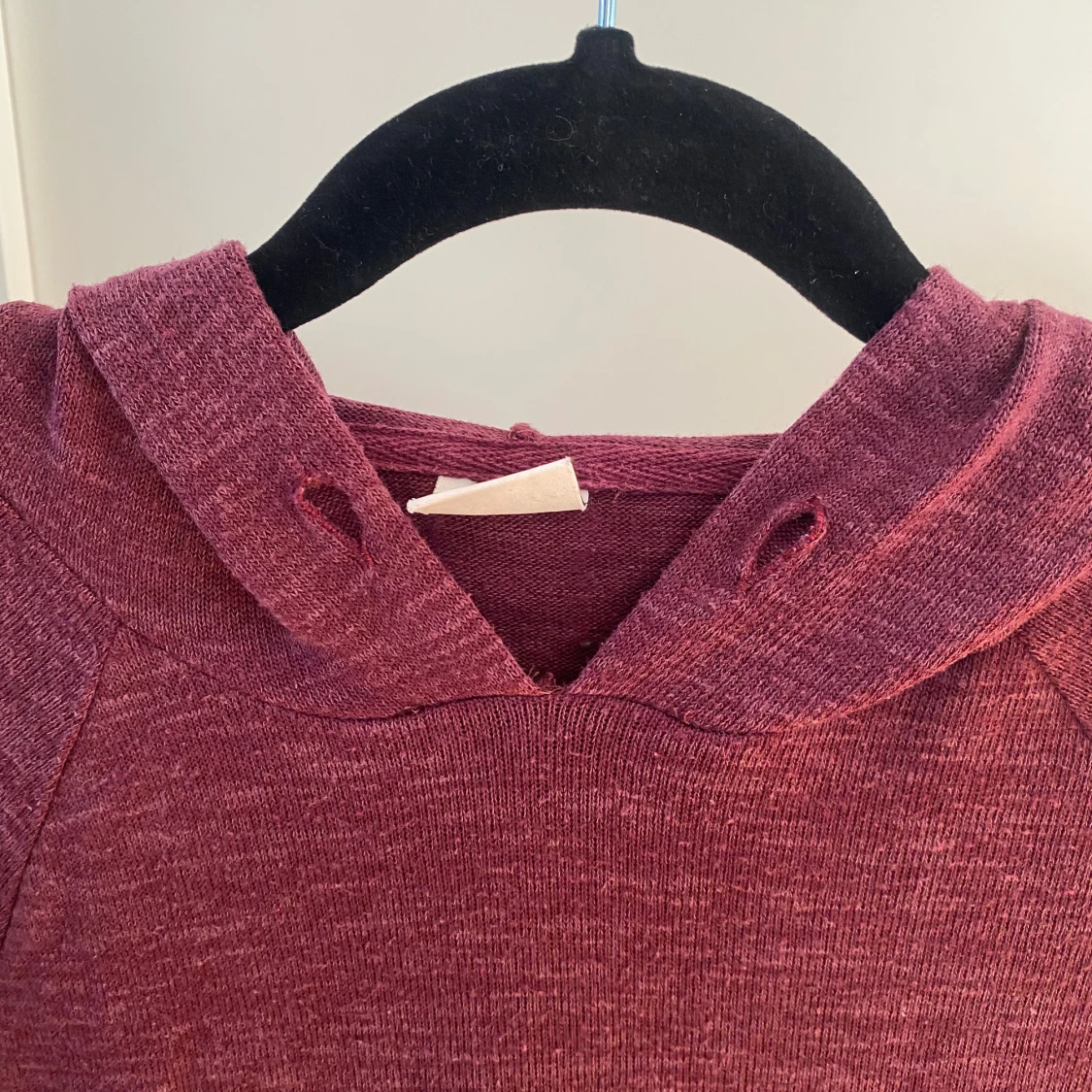 Mysig vinröd hoodie från Gina Tricot i mjukt, stickat material. Tröjan har huva, långa ärmar och en avslappnad passform. Perfekt för chill dagar eller när du vill vara extra bekväm. Mått Över bröstet: ca 51 cm Längd från axeln och ner: ca 67 cm 50% viskos, 25% polyester, 20% bomull och 5% elastan Kommer från ett djur och rökfritt hem.