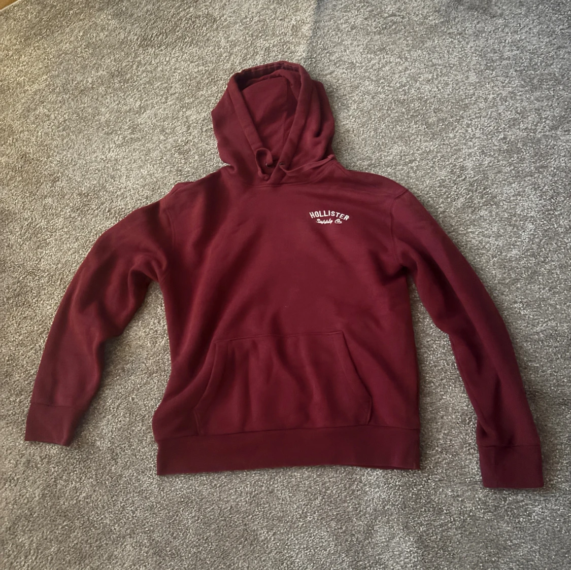 Vinröd hoodie från Hollister med vit logga på bröstet och stor text på ryggen. Klassisk känguruficka framtill, huva med snörning och mjukt material som känns skönt mot huden. Perfekt för chill dagar eller när du vill ha en avslappnad stil.