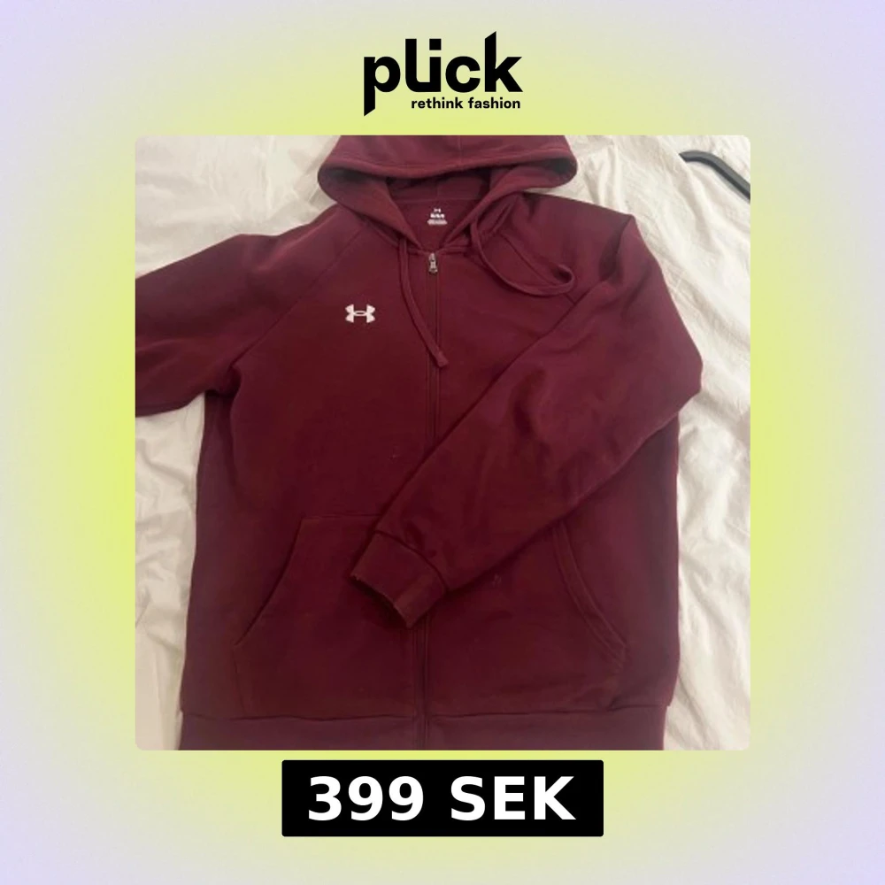 Säljer en vinröd hoodie från Under Armour med dragkedja och huva. Tröjan har långa ärmar och en liten logotyp på bröstet. Perfekt för en avslappnad stil.