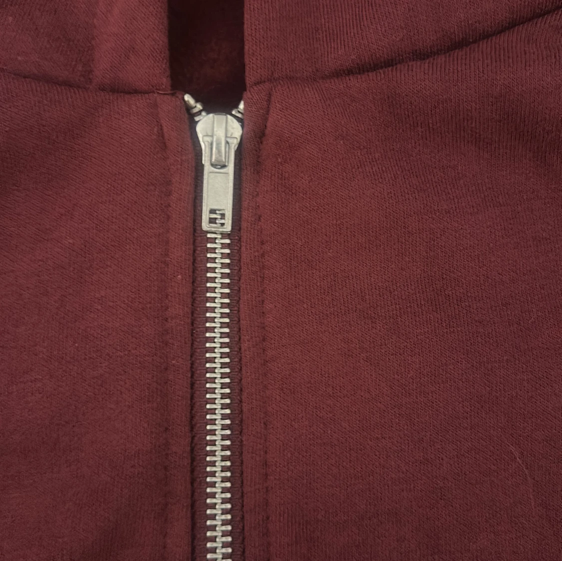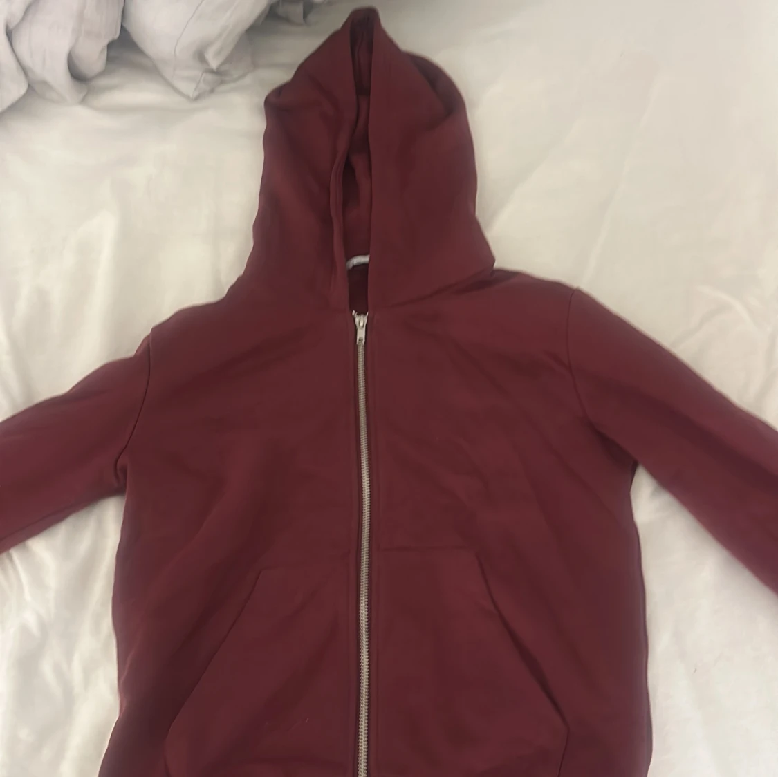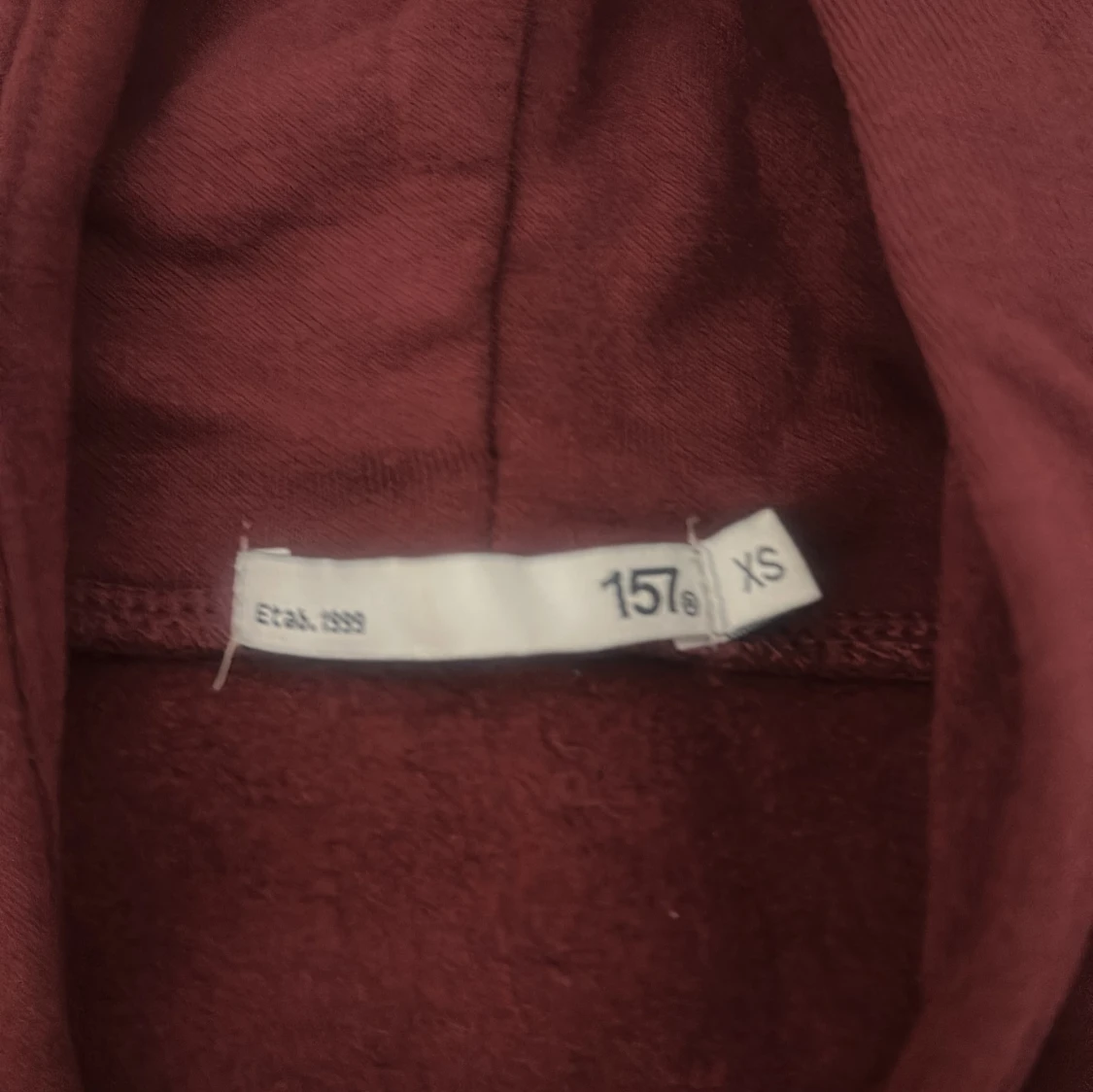Vinröd hoodie från 157 i storlek XS. Tröjan har huva, hel dragkedja framtill och två fickor. Mjukt bomullsmaterial och ribbade muddar vid ärmslut. Perfekt för chill dagar och enkel att matcha med jeans eller joggers.