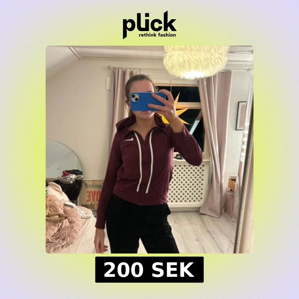 Säljer en snygg vinröd hoodie från Nike med dragkedja och huva. Tröjan har långa ärmar och en vit Nike-logga på bröstet. Perfekt för både träning men även som en skön tröja att slänga på sig💓