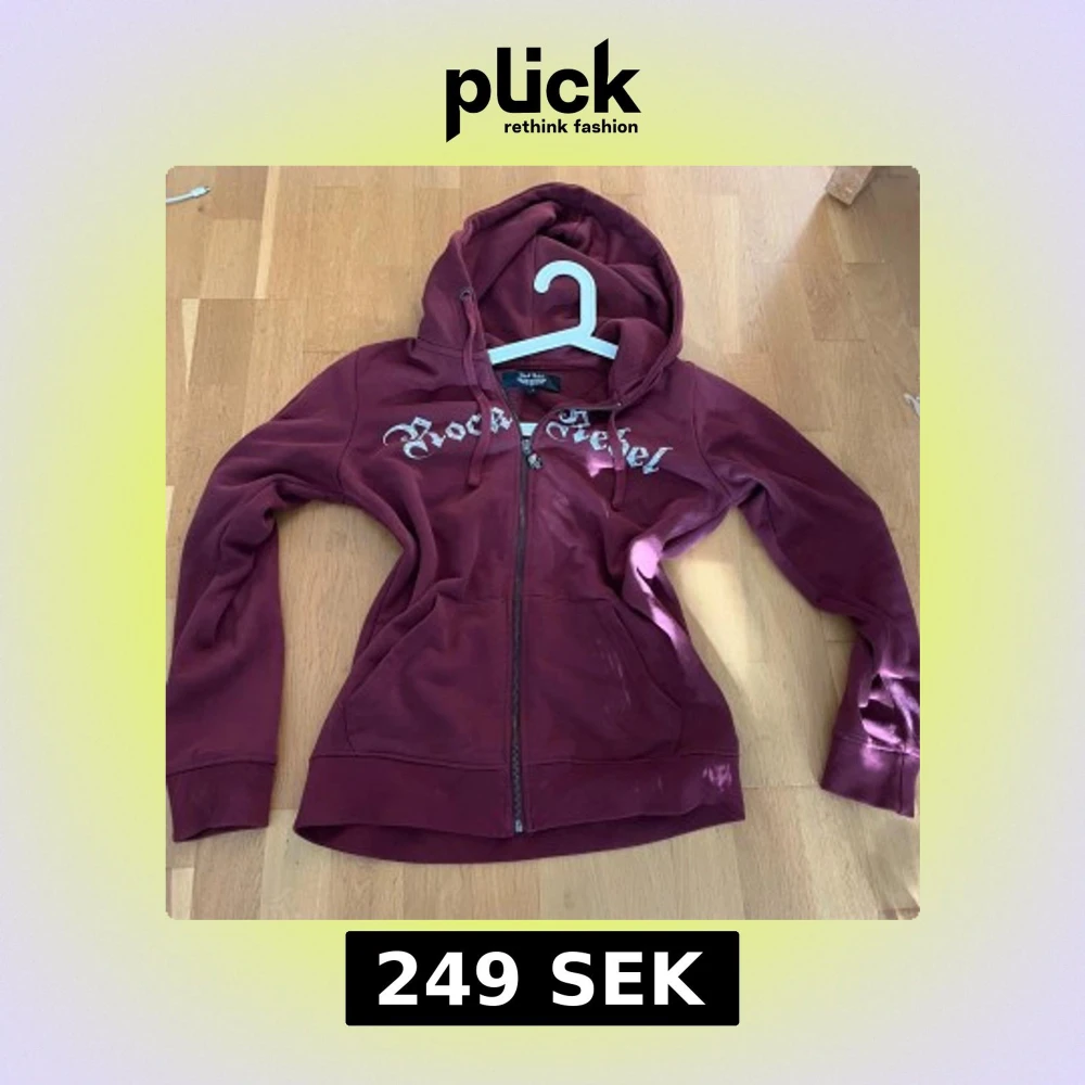 Säljer en vinröd hoodie från Rock Rebel med dragkedja och huva. Framsidan har texten 'Rock Rebel' med glittriga detaljer och baksidan har ett stort tryck med kors och vingar. Mjuk insida och kängurufickor framtill.