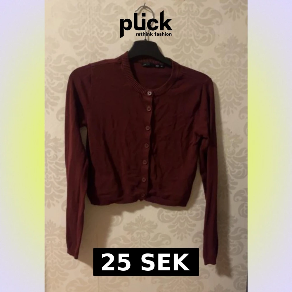 En vinröd kofta med rund hals och knappar hela vägen framtill från 157. Modellen är croppad och har långa ärmar med ribbade muddar. Perfekt att slänga över en topp för en chill look.